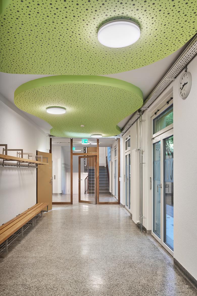 Aufgrund der knappen Dimensionen der bestehenden Klassenzimmer und um die Anpassungsfähigkeit in Zukunft möglichst hochzuhalten, werden die Klassenzimmer und Basisstufen grundsätzlich gleichbehandelt. Pro Einheit wird ein Hauptraum und ein Anteil der Lernlandschaft (bestehende Korridorzone) angeboten.