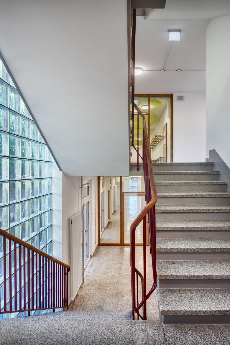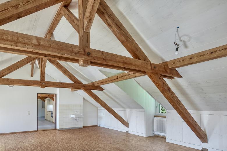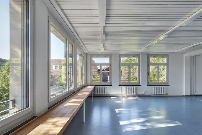 Der Dachstuhl befand sich in gutem Zustand und konnte erhalten werden. Die Konstruktion wurde nach zeitgemässen Anforderungen gedämmt und mit total 12 neuen Lukarnen geöffnet. Der ehemalige Klassenraum wurde in einen grosszügigen Mehrzweck- und Musikraum umgestaltet und der Werkraum in eine Einheit für eine Basisstufe inklusive Teeküche. Ergänzt werden die Räumlichkeiten im Dachgeschoss mit einem Gruppenraum, einem Raum für die Logopädie und Integrative Förderung IF.