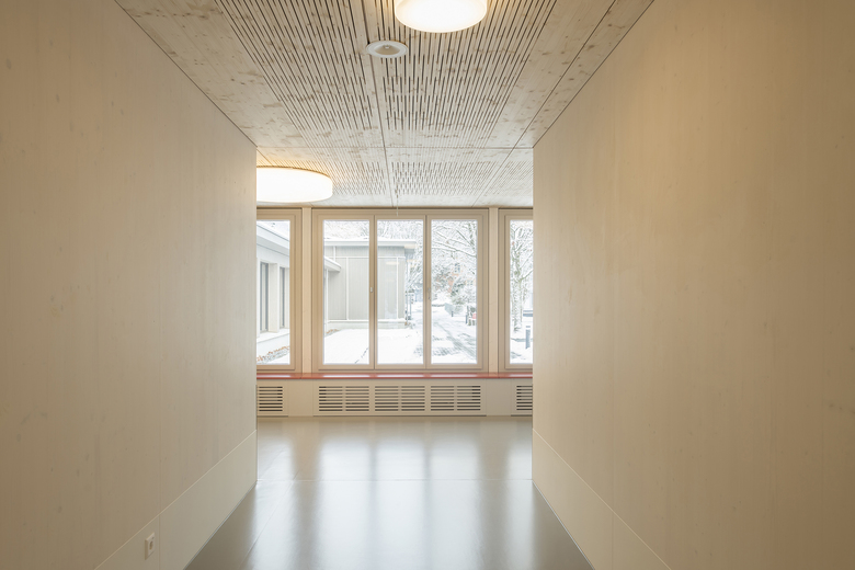 Zum Raumprogramm im Neubau gehören Therapieräume, Büros mit Wartebereich sowie Materialräume. Die als Bewegungs- und Lernzone grosszügig angelegten Korridore verbinden den Therapiebereich mit zwei Schulzimmern mit Gruppenräumen und Galerie sowie ein Raum für den Mittagstisch.