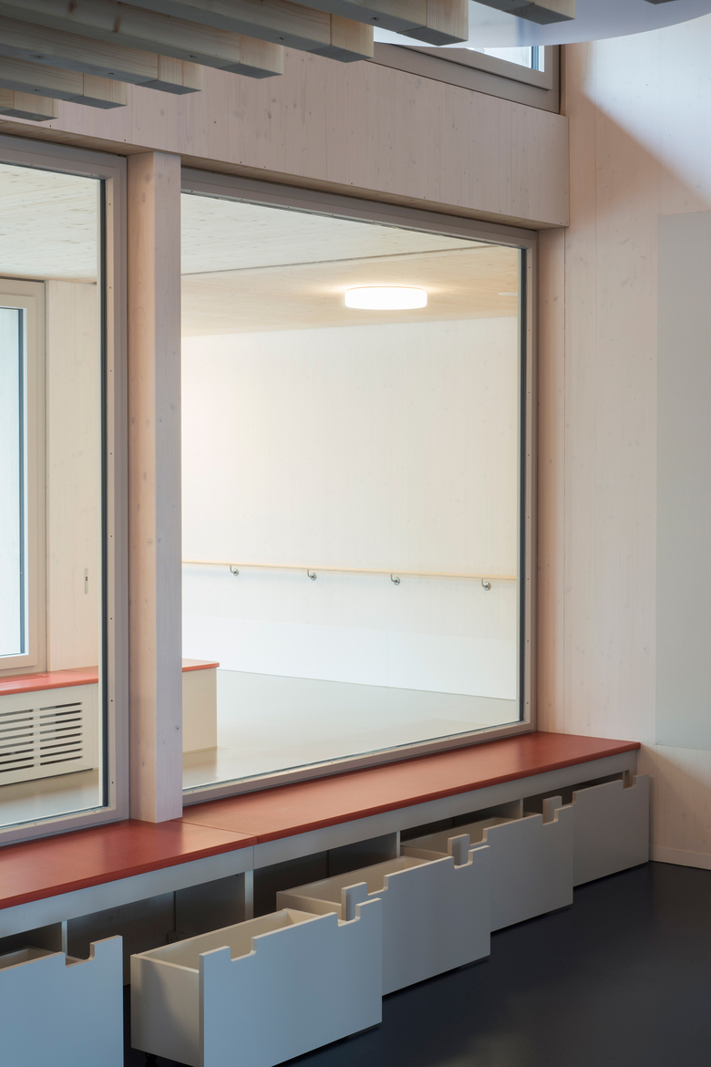 Die Räume sind geprägt durch weiss lasierte Holzwände aus Dreischichtplatten, Lignatur-Holzdecken mit Akustikfunktion sowie Kautschukböden. Verspielt angeordnete runde Lichtscheiben beleuchten die Bewegungszonen. In den Unterrichts- und Konzentrationsräumen sorgen quadratische Deckenleuchten für ein gleichmässiges Arbeitslicht. Die zurückhaltende Gestaltung bietet den Kindern eine ruhige Basis.