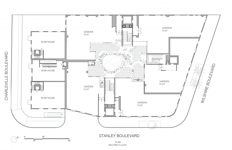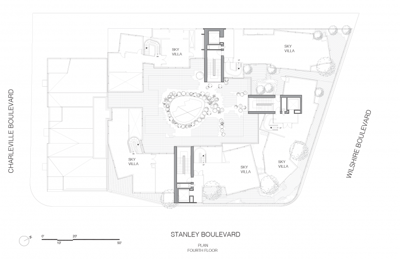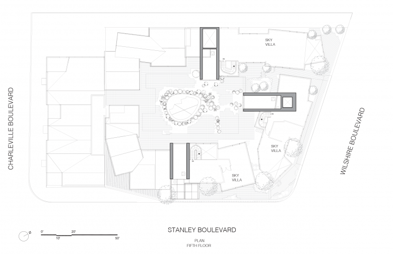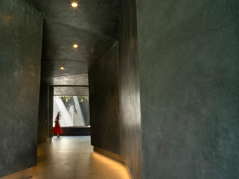 Residents of “Gardenhouse” are welcomed via a ground-floor entrance along Stanley Drive, off Wilshire Boulevard. The entrance adopts the atmosphere of a cave digging into the hillside; a dim, surreal environment where residents are led on a journey through a “fairyland” of light, shadow, and the sound of water. Further ahead, the softness of the cave meets a bright conclusion, with natural light flooding through a connected water feature from the courtyard patio above. Standing beneath this threshold, visitors marvel at a framed view of sun, sky, landscape, and water: a living painting removing people from the reality of the city.