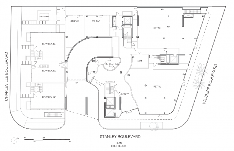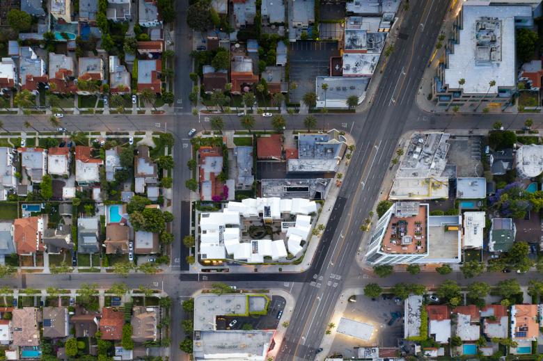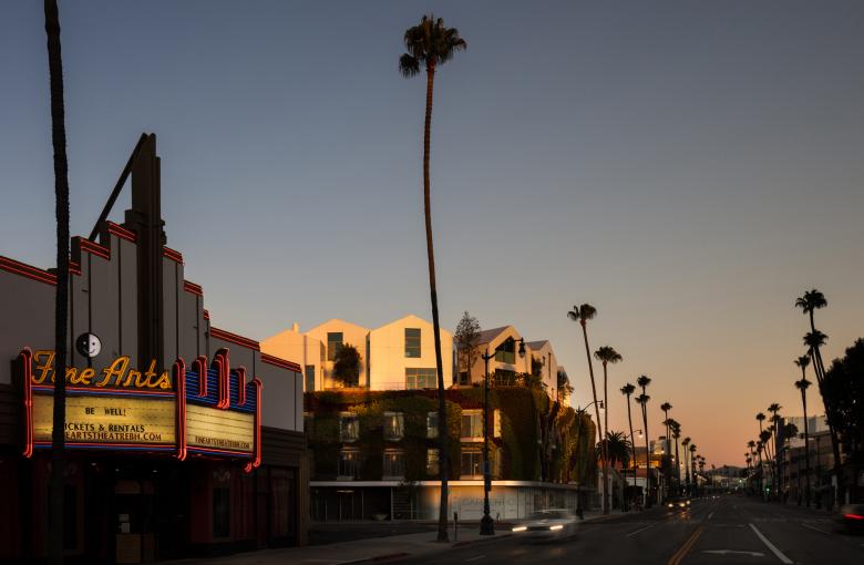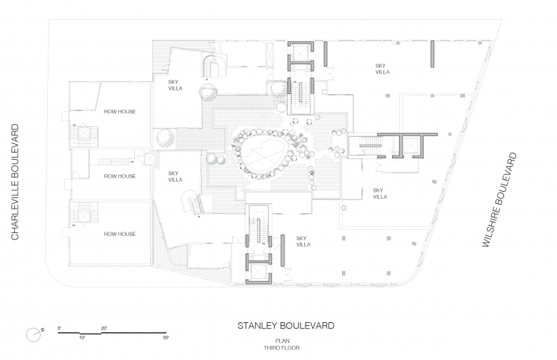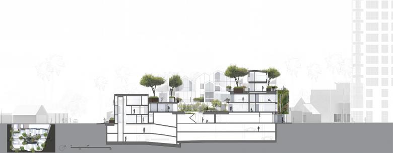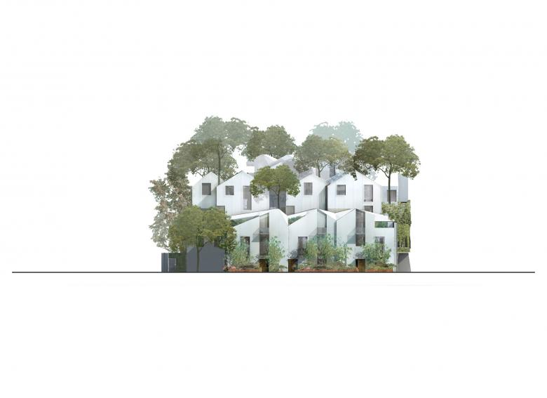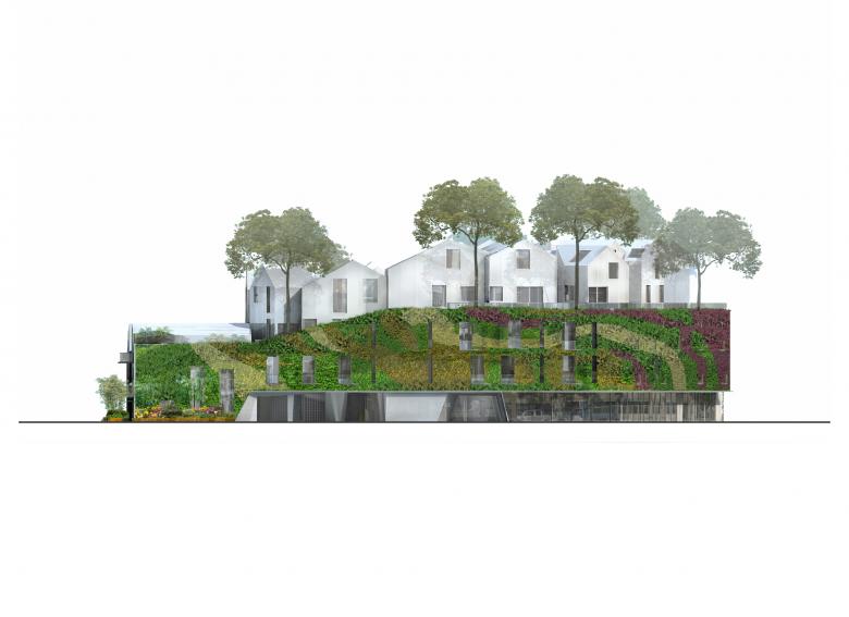 Located at 8600 Wilshire Boulevard in California’s Beverly Hills, “Gardenhouse” is a mixed-use scheme consisting of 18 residential units above ground floor commercial space. Evoking the lush landscape of Beverly Hills, the scheme becomes a “hillside village” with residential units “growing” from the building’s living green wall. Peaking above the landscaped envelope, a cluster of white façaded, irregular-shaped windows, and gabled-roof structures create a dynamic neighborhood, and a playful, witty, though simple homage to the iconic hillsides of Los Angeles.