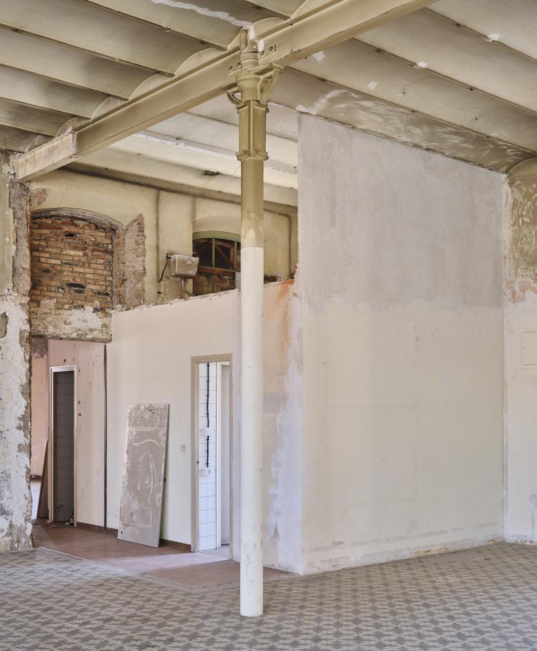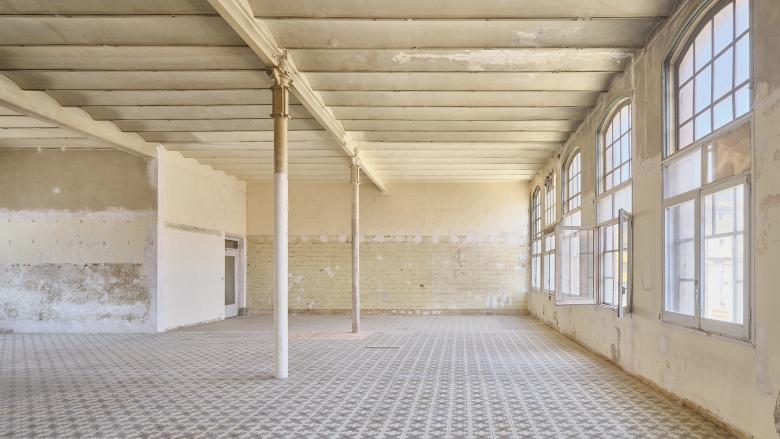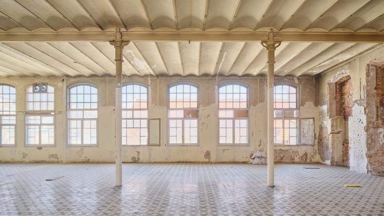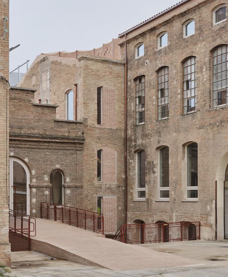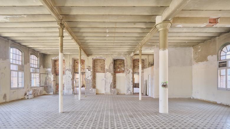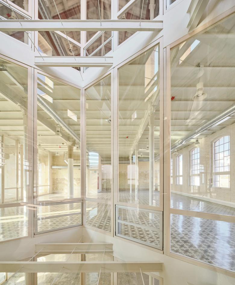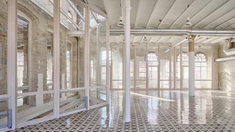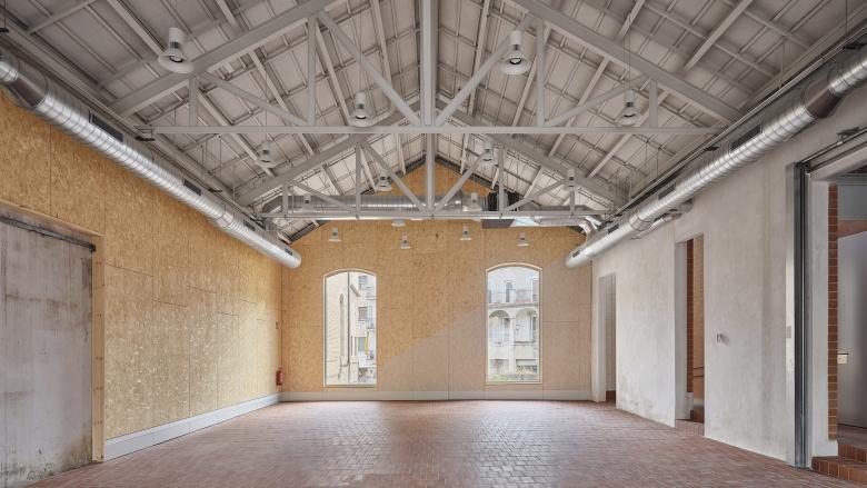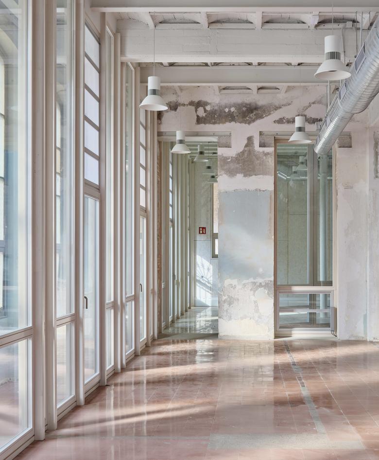 The architectural ensemble consists of three volumes: the street-facing building, originally used as a textile factory that benefited from surplus electricity; and two parallel structures accessed through a passageway and central courtyard, which housed the boilers and machinery. The basements contained coal bunkers and smoke extraction ducts connected to the large chimney. In the new functional layout, the largest volume remains open-plan to accommodate performances and multipurpose activities, while the central building has been converted into a public foyer. The upper floors of the former textile factory now house municipal offices.
