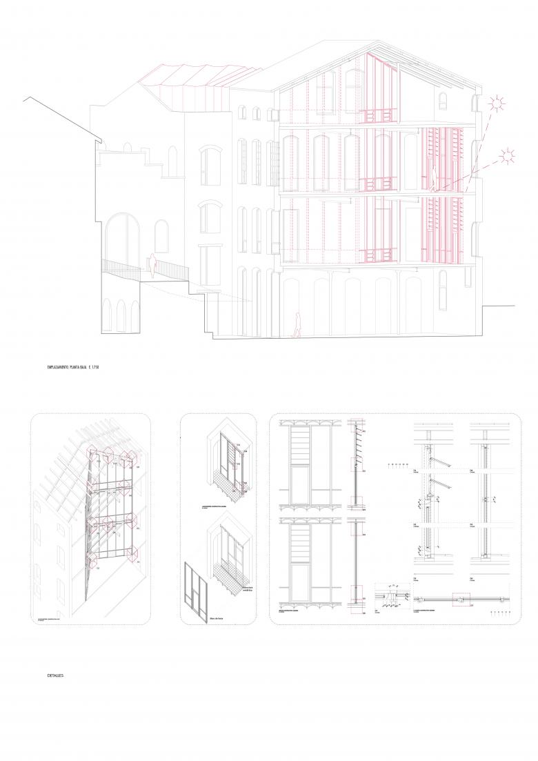 The conservation of the façades and the memory of the original interior volumes form the foundation of the proposal, reinforced by a passive environmental strategy that structures and organises the space. The introduction of a glass gallery functions as a bioclimatic buffer, providing shade and natural ventilation in summer while enabling solar gain in winter. A full-height central void operates as a vertical ventilation chimney, promoting cross ventilation, natural daylighting and visual connectivity between floors, while revealing a historic interior façade.