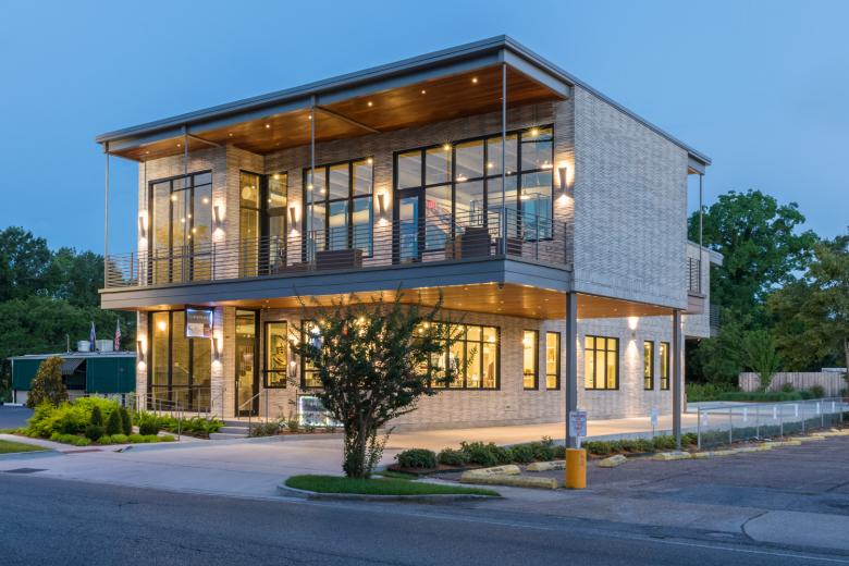 Locating the building as close to the street as permissible and rotating the second-floor mass 90 degrees allowed the user a signature business and architectural presence on the busy thoroughfare, while allowing vehicular traffic to traverse to the back of the property where the parking is required to be. Meeting DOTD clearance requirements mandated a first floor clearance of 13’-6” minimum. While these and other mandates could be seen as limits on the owner’s ability to develop the property, NANO chose to look at them as opportunities. The stature of the building enhances the exterior porch (a Mardi Gras favorite) and the interior spaces are lofty.