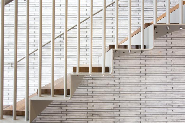 The foyer hall allows for a soaring double height space, while the client’s expertise in metal-working brought the grand stair to fantastic fruition. Finishes are clean, simple and chosen for high traffic endurance, slip resistance, and ease of maintenance.