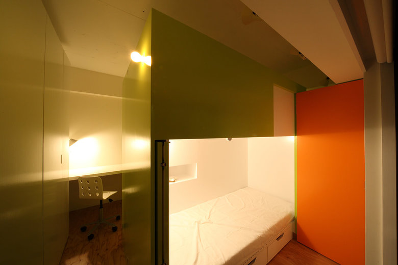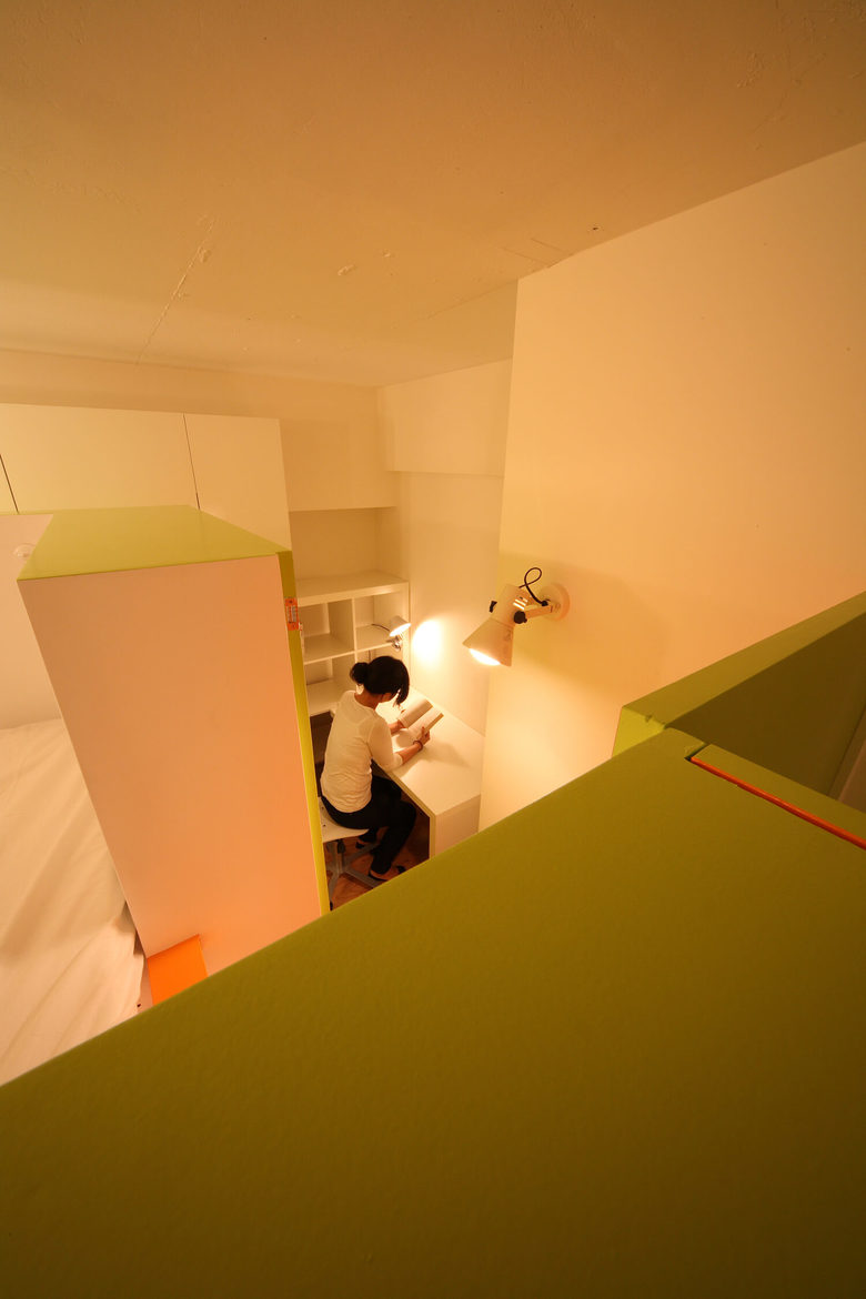 まず、既存間仕切りを撤去して、大きな空間を確保し、親子で上下に寝ることのできる2段ベッドボックスを部屋の奥に設置した。ボックスと周りの壁の間には60cmの通路が確保され、ぐるりと周遊できるようになっている。通常は閉じられているボックスの扉は、開くことによって、廊下を閉じることになり、リビングからのプライバシーを確保することが出来るようになっている。また、部屋の奥に設置されている収納の扉を開くことによって、親子のスペースの間にもプライバシーを確保できるように工夫した。