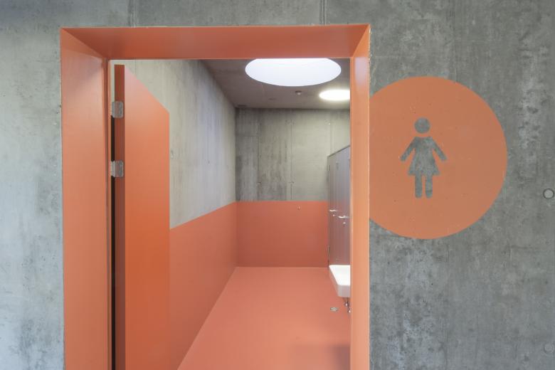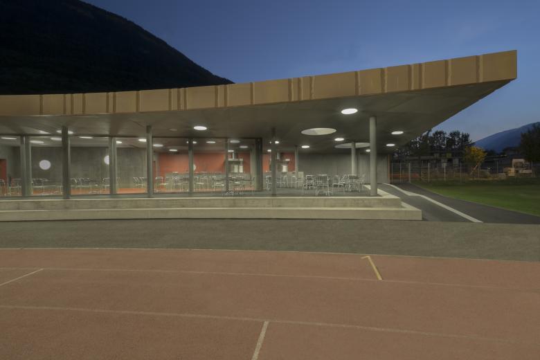 Das Referenzniveau des Gebäudes liegt erhöht zur Spielfläche. Der vorgelagerte gedeckte Erschliessungsbereich ist auch Aussentribüne.