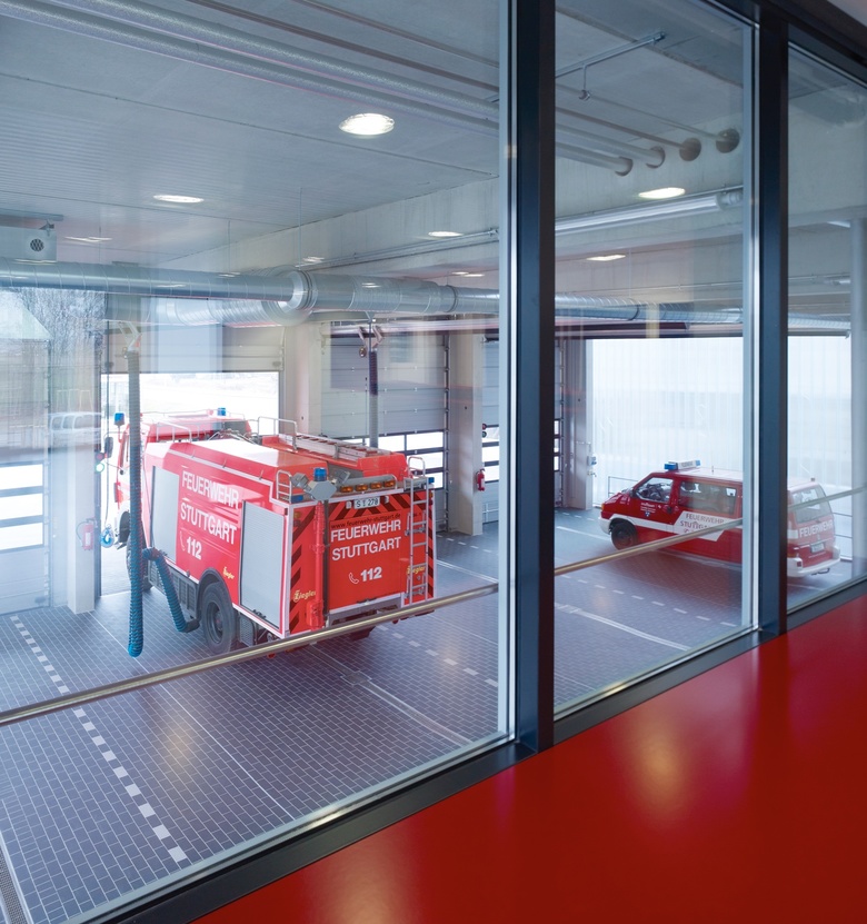 Über das Foyer geht es zu den am stärksten frequentierten Bereichen: den Umkleiden, der Fahrzeughalle und zum Sitzungssal im Obergeschoss. Die durchgehende Verglasung im Obergeschoss zur Fahrzeughalle stellt das zentrale Thema des Gebäudes in den Mittelpunkt: die Einsatzfahrzeuge. Der Blick vom Obergeschoss in die Fahrzeughalle gibt eine weitere wesentliche gestalterische Absicht preis: die prägnante Farbigkeit in den Aufenthalts- und Umkleidebereichen steht im Kontrast zu der fast surreal anmutenden lichten Fahrzeughalle mit ihrer raumhohen Verglasung aus gerilltem Profilbauglas.