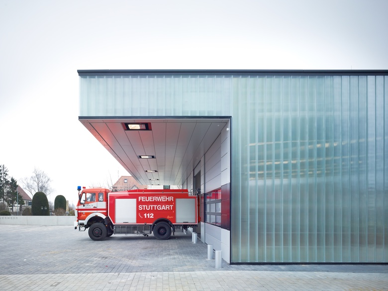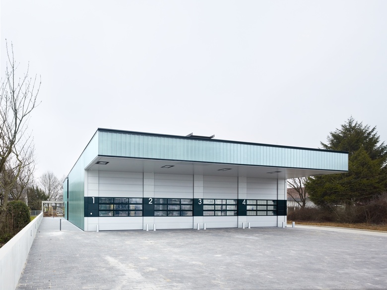 Mit seiner Proportion und der umlaufenden Industrieverglasung aus Gußglas orientiert sich der Neubau an seinem städtebaulichen umfeld - dem Gewerbegebiet Entenäcker. Die Transluzenz der Fassade ermöglicht auch die Ablesbarkeit der inneren Organisation des Gebäudes: die Fahrzeughalle mit 4 Stellplätzen und vorgelagertem Übungshof Richtung Osten | die Aufenthalts- und Umkleidebereiche, die über 2 Geschosse Richtung Westen angeordnet sind, und sich zum Parkplatz und Grünbereich hin orientieren. Der Neubau ist ein 2-geschossiger, präzise formulierter Kubus, der auf zwei Seiten "gestört" wird: zur Ostseite kragt das Dach um ca. 4,50 m aus, um die Zu- und Ausfahrt der Einsatzfahrzeuge zu schützen. Dieser "Ausschnitt" ist horizontal und vertikal mit Blechpaneelen verkleidet. Die Sektionaltore sind in der vertikalen Fläche integriert. Das mit rubinroten Holzplatten verkleidete Eingangsfoyer dient als "Schaufenster" zum Parkplatz im Westen und signalisiert eine übersichtliche Orientierung im Haus.