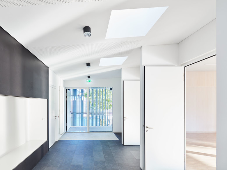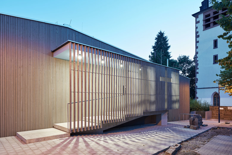 Der überdachte Haupteingang zum zentralen Foyer im Erdgeschoss befindet sich auf der Nordseite. Das in die äußere Holzschalung dezent eingearbeitete Kreuz signalisiert die inhaltliche Bedeutung des Neubaus als christliches Gemeindehaus. Auf der Südseite zeigt sich das Gebäude 2-geschossig und ermöglicht dadurch den direkten Aussenbezug der Mehrzweckräume zum Garten. Die bestehenden Lagerräume auf der Hangeschossebene wurden hinter einer Sichtbetonwand in das Gesamtensemble integriert.