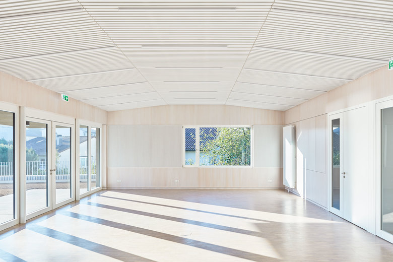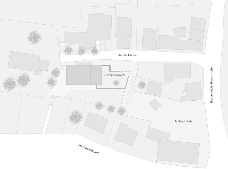 In Huchenfeld ist ein neuer zentraler Gemeindeplatz entstanden. Das nach Norden eingeschossige Gemeindehaus fügt sich in den städtischen Kontext zwischen Kindergarten und Wohnhäuser und ermöglicht eine bessere Sicht vom Rathaus auf die Kirche, die dadurch wieder mehr an die Ortsmitte angebunden wird.