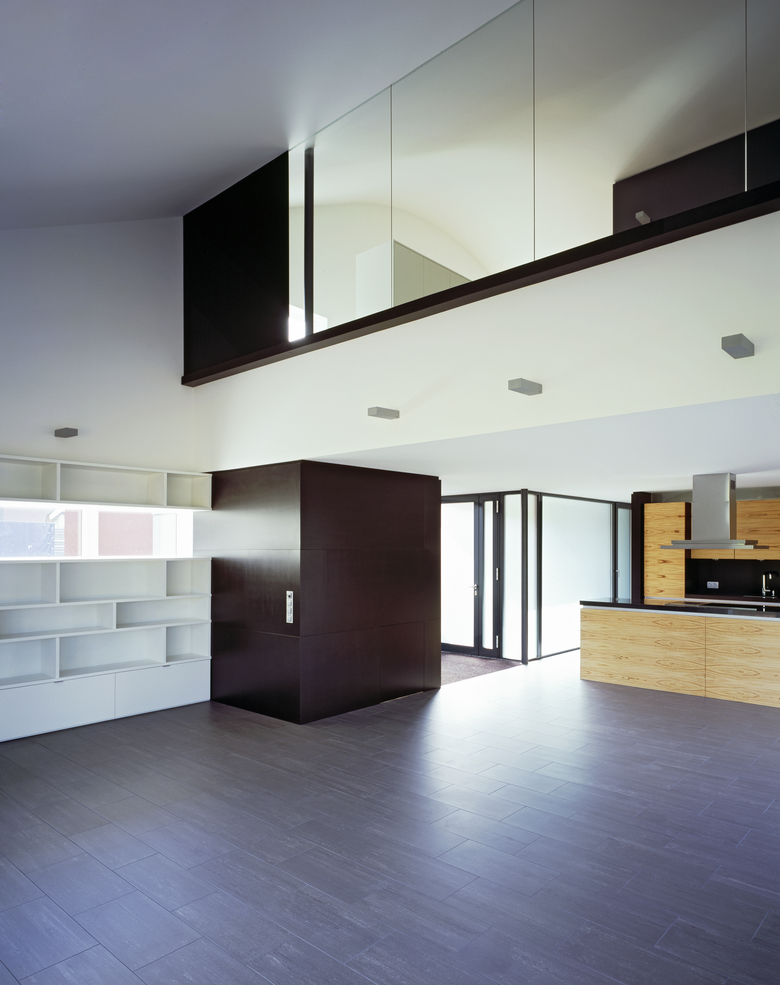 Konzipiert für eine Person mit Kind ist das Gebäude in zwei Bereiche gegliedert: Der Wohn- Aufenthalt -Schlafbereich über zwei Etagen mit eingestellten NebenraumKuben, nach dem Prinzip "Raum im Raum" und der Kinderbereich, als abgetrennte Raumeinheit, die später als Einliegerwohnung nutzbar ist. Das Gebäude ist von Osten über einen in die Fassade eingeschnittenen Zugangsbereich erschlossen.
