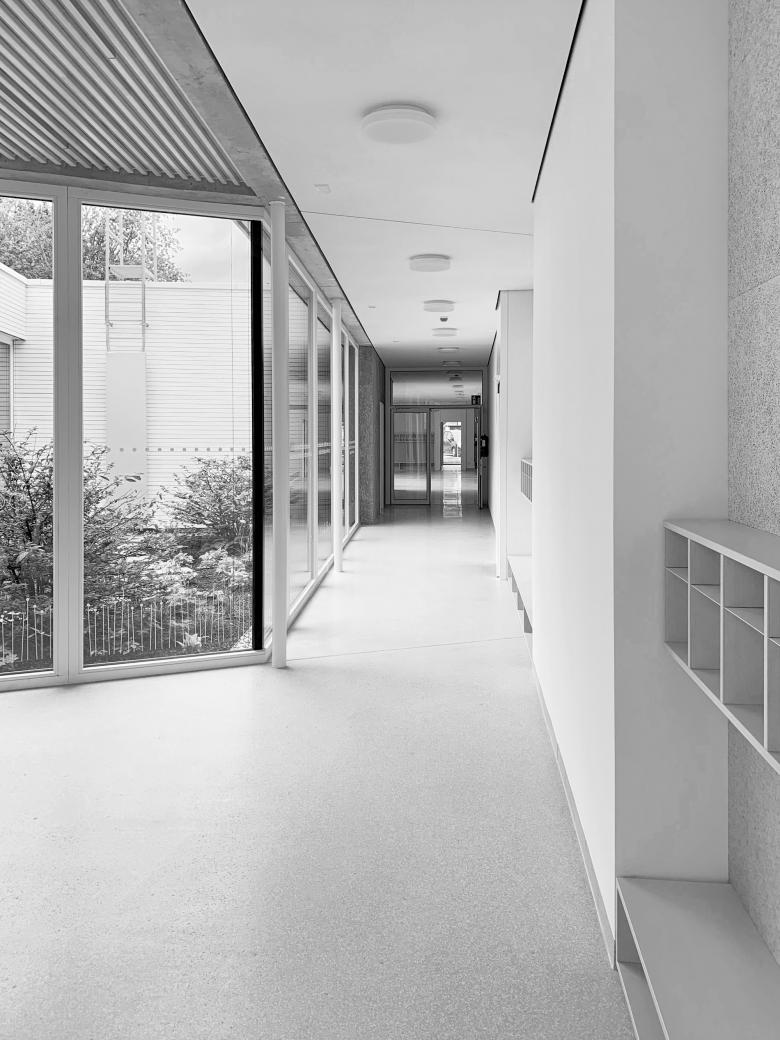 Während die Personal- und Nebenräume direkt hinter der lärmschützenden Betonschale liegen, sind die Gruppenräume vom Hausgrund zurückgesetzt angeordneten und mit einer Holzschalung sowie raumhohen Fensterelementen umfasst.