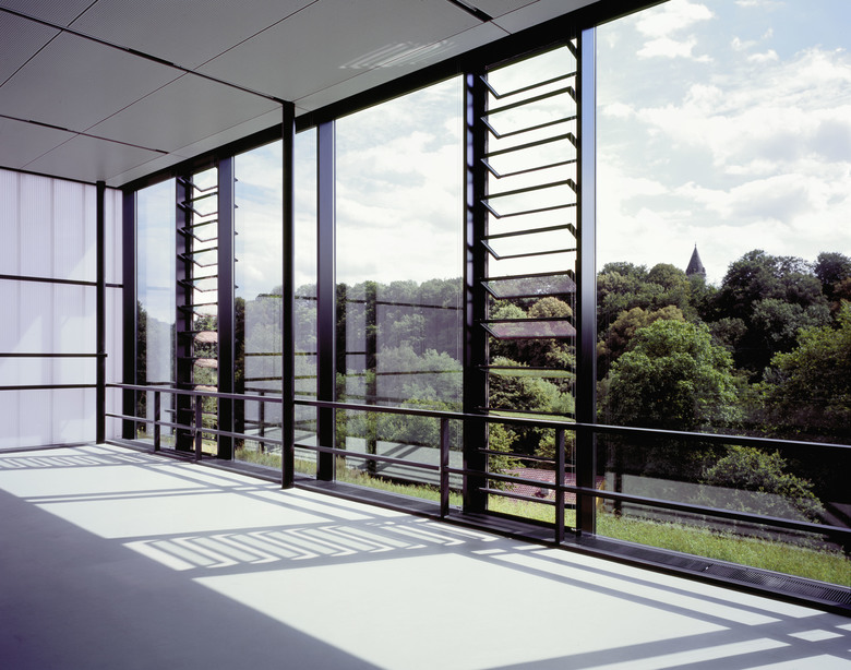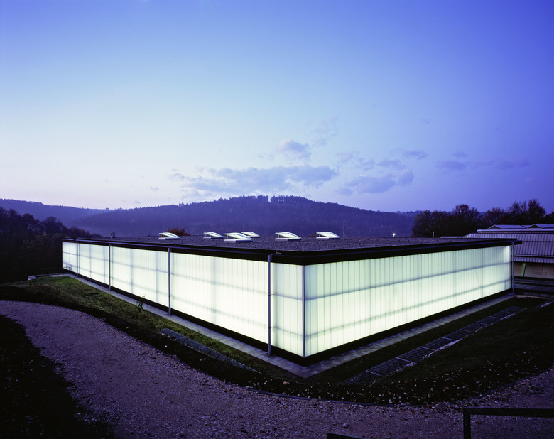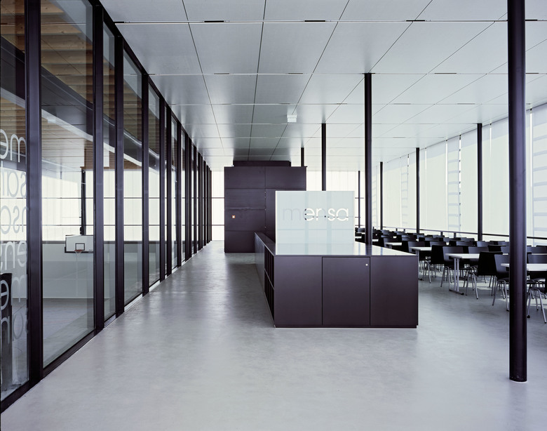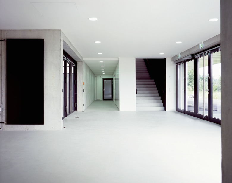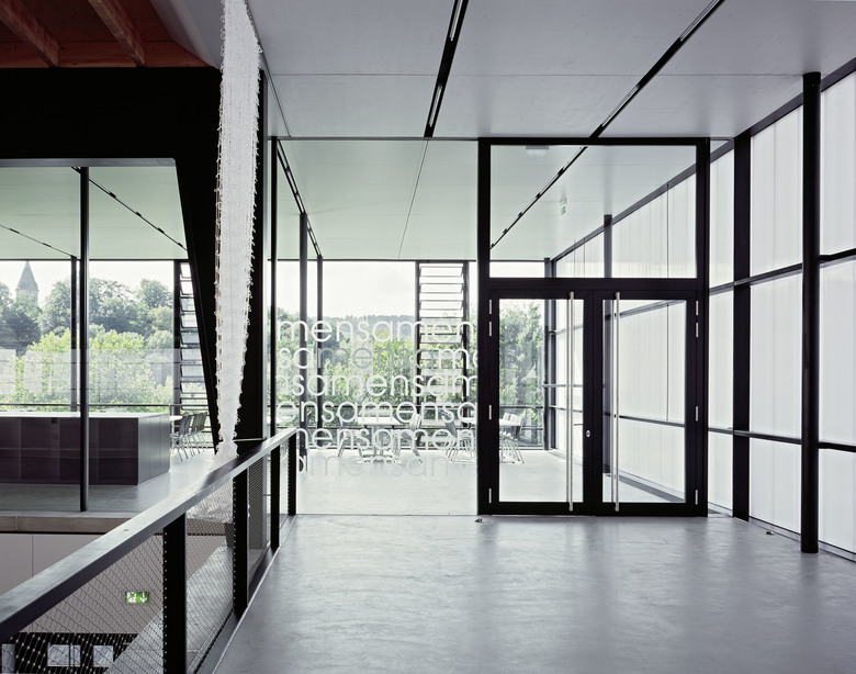 Bewusst gewählt sind auch die Blickbeziehungen von der für 200 Schüler ausgelegten Mensa aus: einerseits in die Halle, talseits auf das gegenüber gelegene, von altem Baumbestand umgebene, ehemalige Benediktinerkloster Lorch. Das Low-Tech-Energiekonzept des Gebäudes beinhaltet vier Erdkanäle, die die Zuluft im Winter vorwärmen und im Sommer vorkühlen.