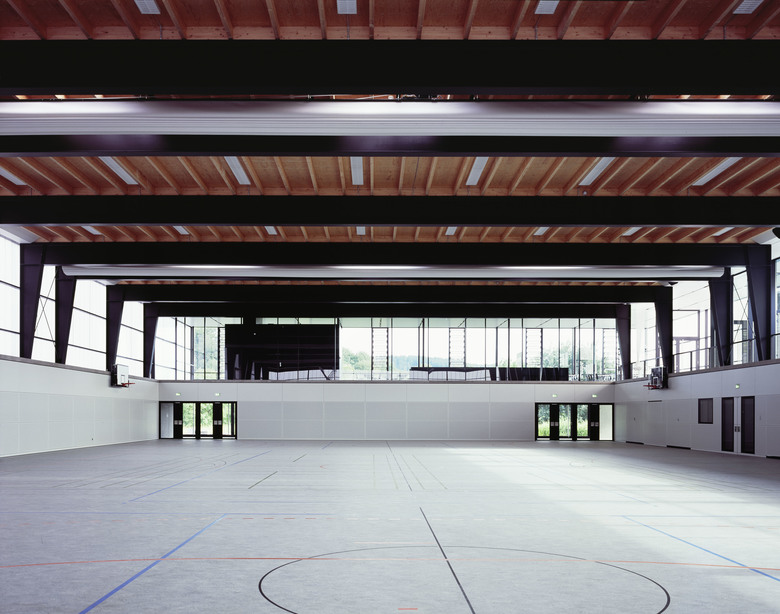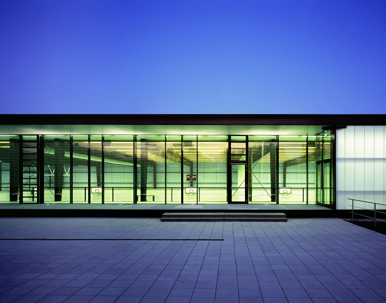 Östlich der bestehenden Dreifeldsporthalle, mit einem Geschoss in den Hang eingegraben, lässt sie durch die Abfangung mit einer talseitigen Sichtbetonwand einen attraktiven Pausenbereich für die Schüler entstehen. Unter dem Hof sind die beiden Hallen miteinander verbunden, teilen sich Umkleideräume, Sportgeräte lassen sich von Halle zu Halle transportieren. Alle wesentlichen Zugangszonen und Flure im Untergeschoss werden mit Tageslicht versorgt und leiten entlang eines Fensterbandes in die Umkleideräume. Die großzügige Überdachung des Eingangsbereiches auf Hofniveau bietet eine schützende Wartezone und leitet in das Foyer mit Blick auf die Dreifelderhalle. Eine dezente Materialität und Farbigkeit prägt den Raumeindruck: lindgrüne Wandoberflächen, schwarze Stahldachträger mit Holzelementfeldern und die umlaufende Stahl-Glas-Konstruktion, in der transluzente im Wechsel mit transparenten Glasflächen bewusste Ein- und Ausblicke gewähren.