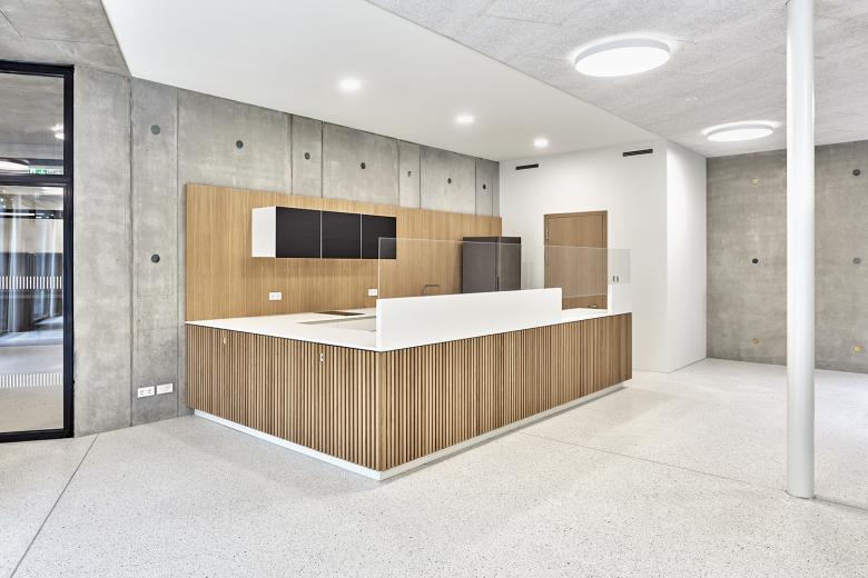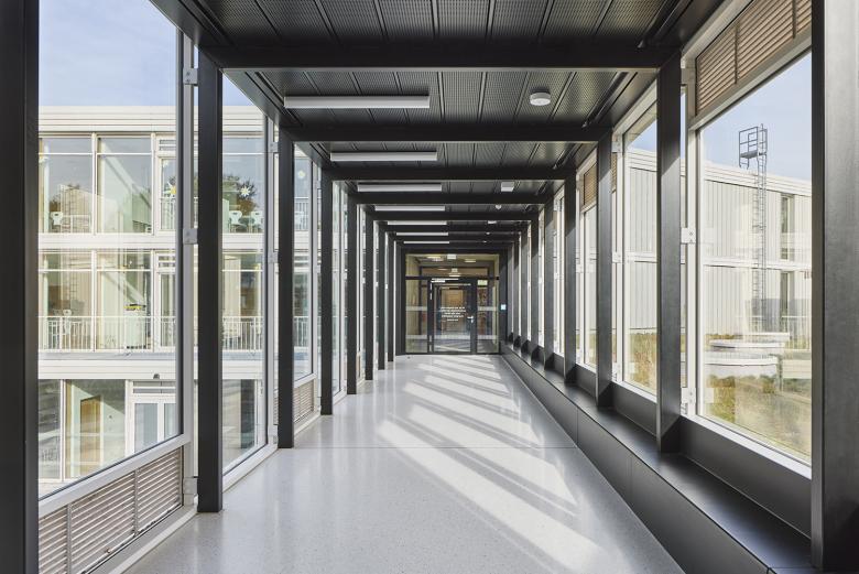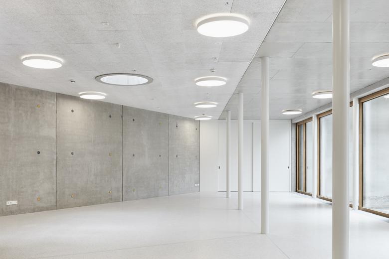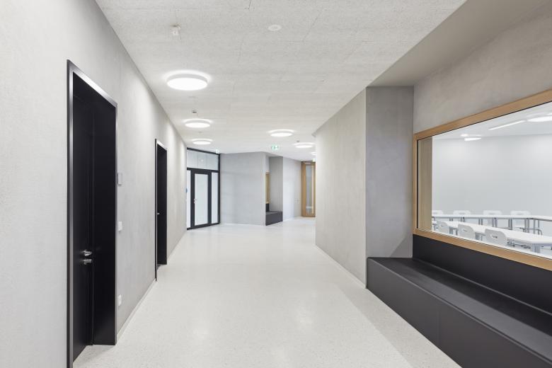 Hang mit Sitzstufen und gibt dem großen Aufenthaltsbereich Licht, Raum und die zusätzlich gewonnene Möglichkeit schulinterne Veranstaltungen. Die Erweiterung der Lehrerräume schiebt sich als eingeschossiger erdüberdeckter Baukörper unter den Hang und bildet mit dem Bestand einen introvertierten Ruhehof für die Lehrer. Der Neubau ist nun nicht nur über einen Verbindungsgang funktional verwoben mit dem energetisch, bau- und brandschutztechnisch instandgesetzten Bestandsgebäude.