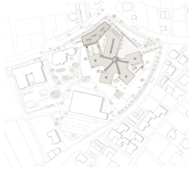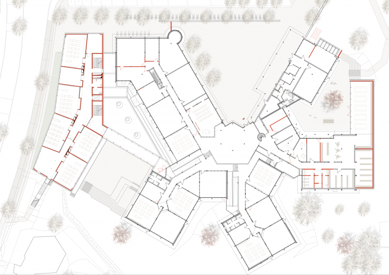 Wie kann ein in sich abgeschlossenes eigenständiges und bestens funktionierendes Schulgebäude auf engstem Grundstück erweitert werden, ohne seine windmühlenartige Grundrisskonstellation abzusprechen? Das Ziel heißt, die bestehende Hangsituation ausnutzen und dezentral an den Stellen anbinden wo es funktional Sinn macht. Zur Entwicklung des neuen Klassentrakts mit 17 Klassenräumen werdendie vorhandenen geometrischen Linien und Kanten des ostlich Bestandes genauso aufgenommen wie der abgelenkte Straßenverlauf im Westen. Die daraus entstandene individuelle Geometrie des Hauses gleicht einem schlanken Bumerang. Ein Aktionshof öffnet sich zum tribünenartig gestaffelten