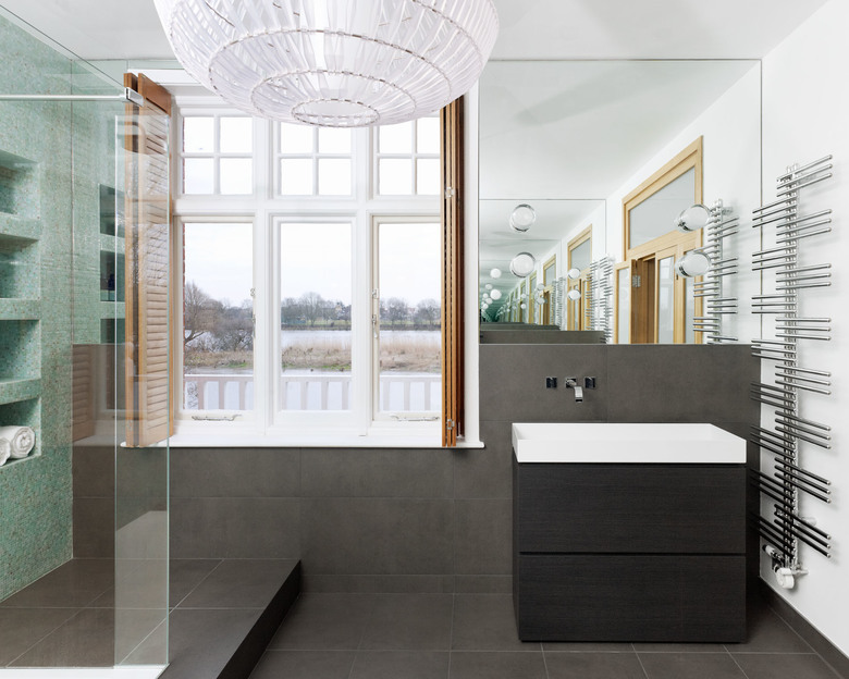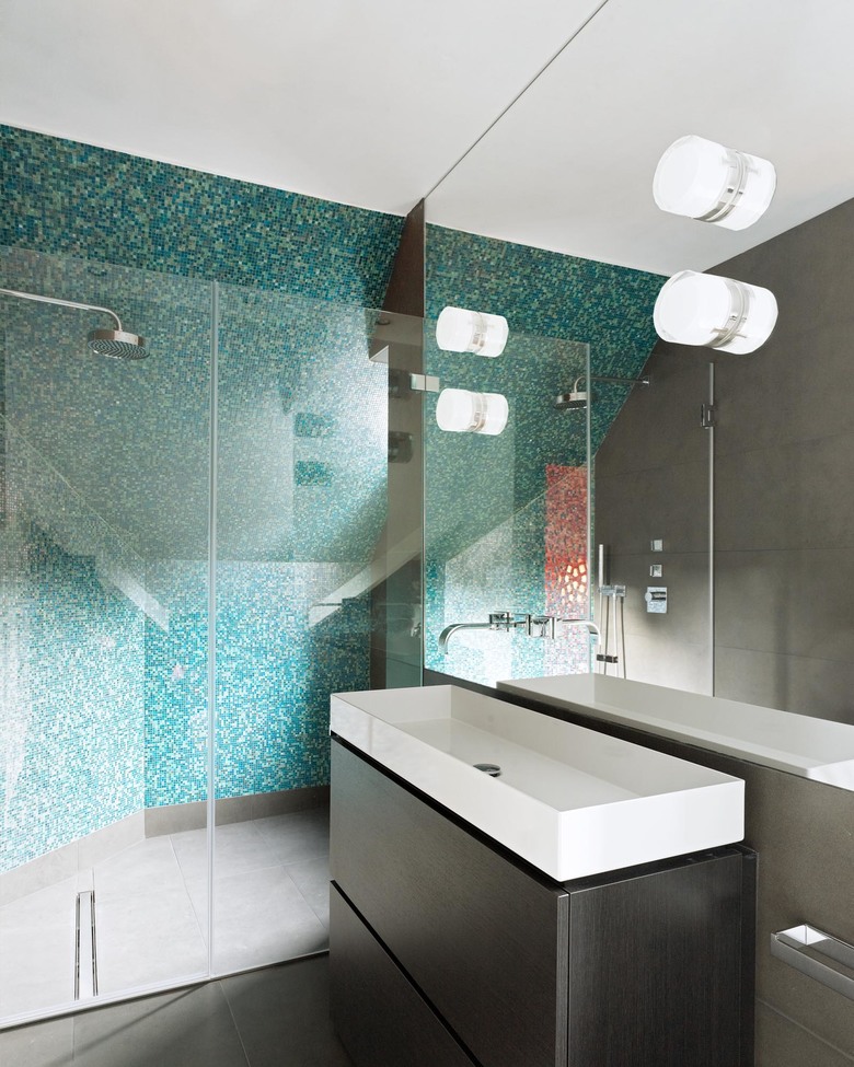 Dusche in Glasmosaik Bisazza mit Blick auf die Themse über die Spiegelfront/Wand