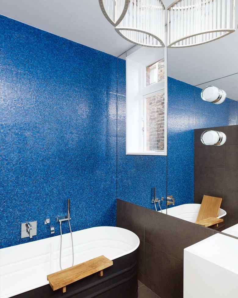 Blaues Bisazza-Glasmosaik und freistehende Badewanne Vieques von Patricia Urquiola