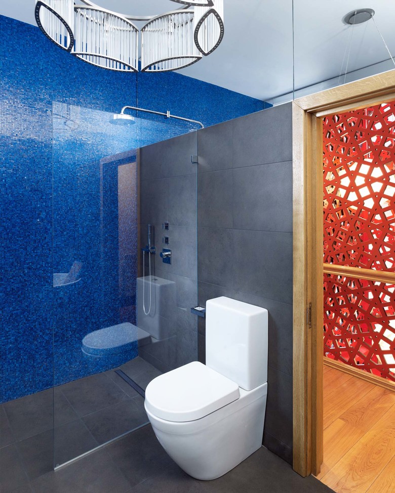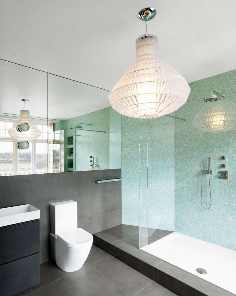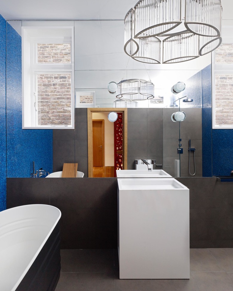 Die vier Bäder des Londoner Stadthauses aus dem 19. Jh. haben ein neues Gesicht erhalten. Edle Materialien und ausgewählte Farben verleihen eine persönliche Note und schaffen dank sorgfältiger Ausgestaltung der Details Räume mit Wohlfühlcharakter. Das Umbaukonzept setzt sowohl auf wiederkehrende Elemente als auch auf individuell gesetzte Akzente: Alle Bäder haben Bodenplatten in anthrazitfarbenem Feinsteinzeug und grossformatige Spiegelflächen mit aufgesetzten Spiegelleuchten. Die Farbe der Glasmosaik-Steinchen jedoch ist unterschiedlich, dadurch erhält jeder Raum eine eigene Stimmung. Für Eleganz schliesslich sorgen die edlen Lüster.