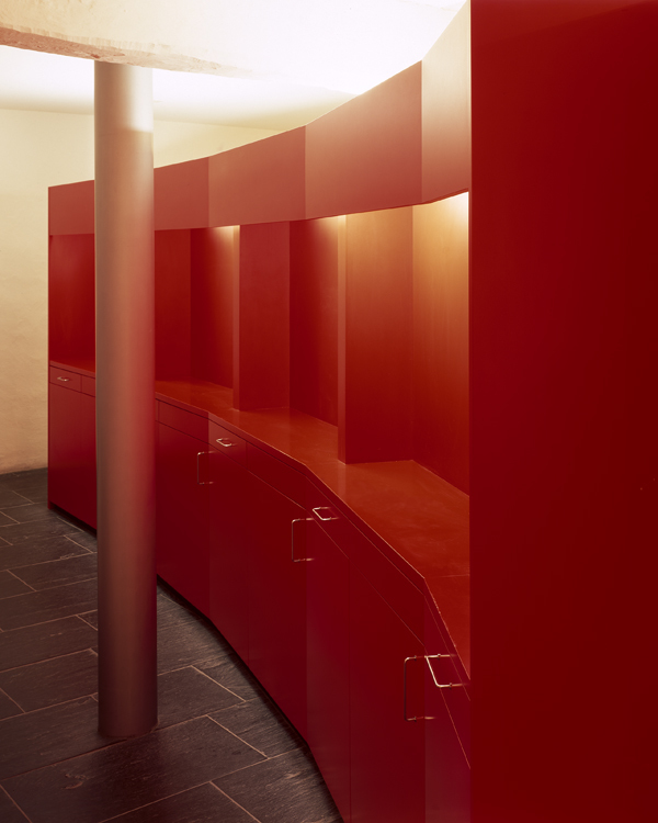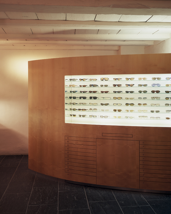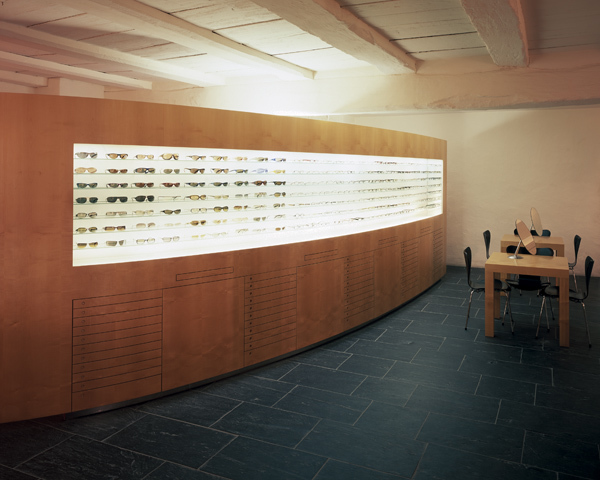 Das Optiker-Geschäft Dudli ist in der Stadt Wil fest verankert. Nicht nur pflegt sein Besitzer den aufmerksamen Kontakt mit den Wilern, das Geschäft ist Teil der alten Stadtmauer beim ehemaligen Kuonzentor, die Aussenmauern mit ihrer beindruckenden Tiefe sind Zeuge davon. Die raumhaltigen Fensternischen geben den Blick ins Ladenlokal frei und lassen sich als Schaufenster bespielen. Dahinter liegt der quadratische Verkaufsraum mit der restaurierten Renaissancedecke und einem Schieferboden. Ein langer, geschwungener Einbau aus Holz gliedert den Raum in zwei Bereiche für Beratung und Untersuchung, gleichzeitig dient er als Brillen-Auslage.