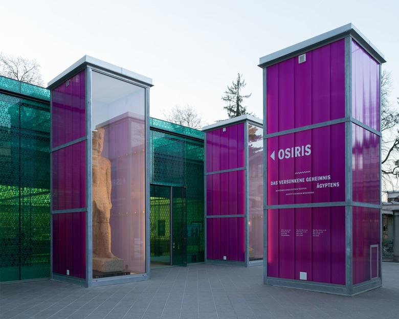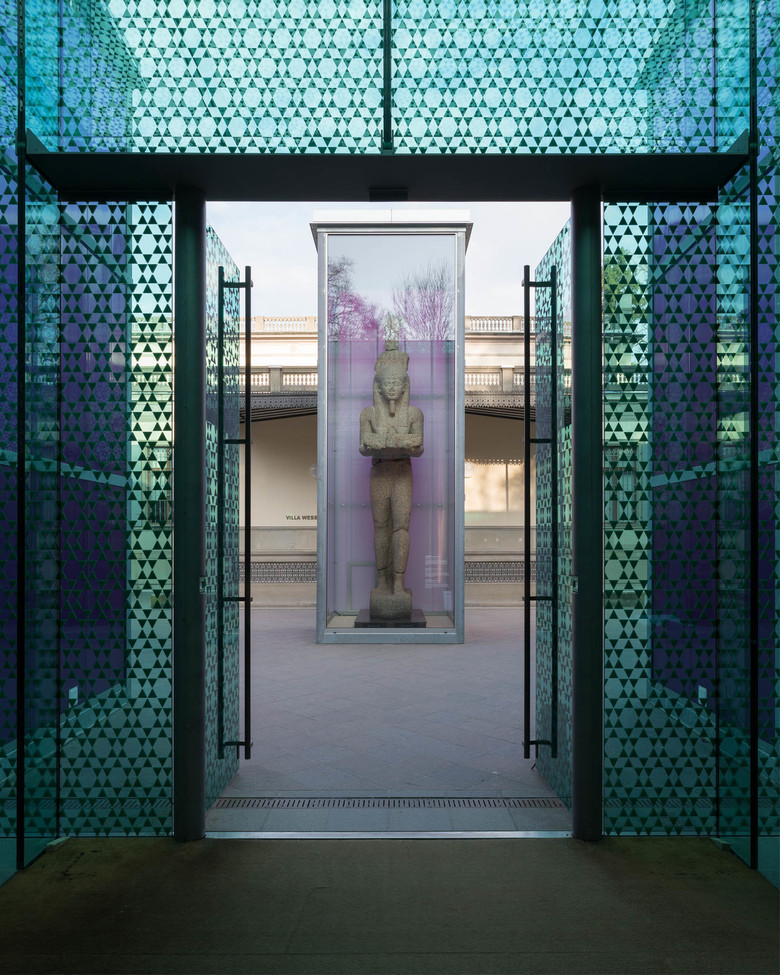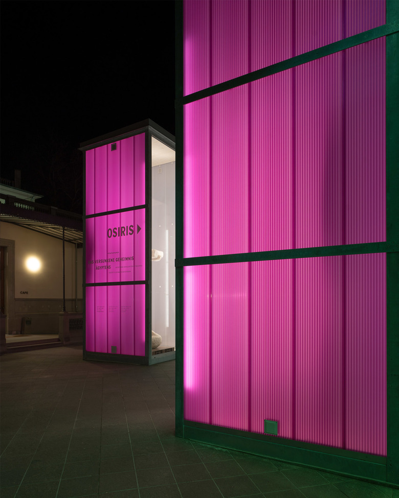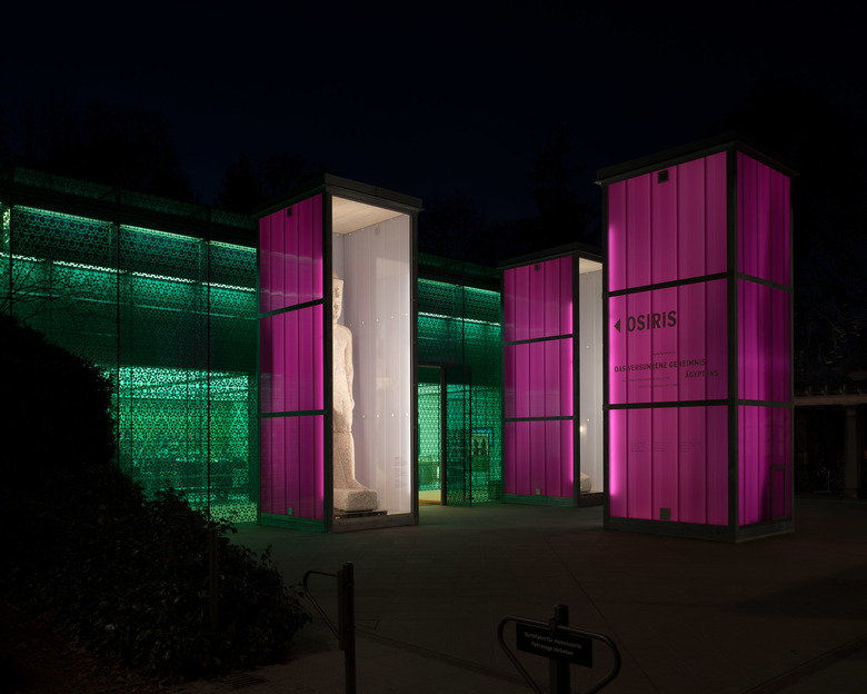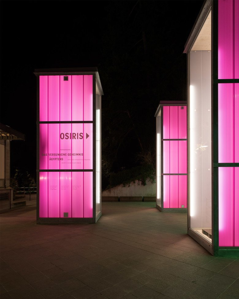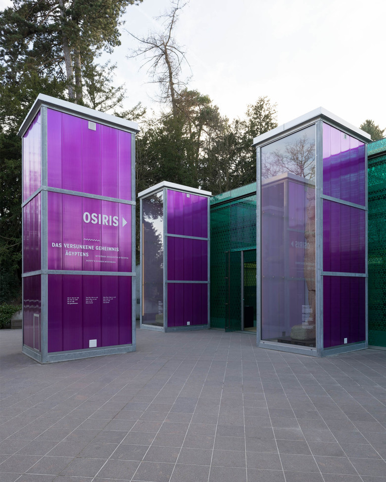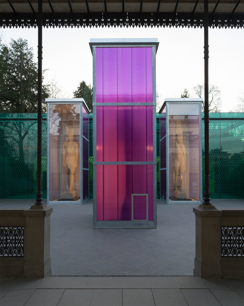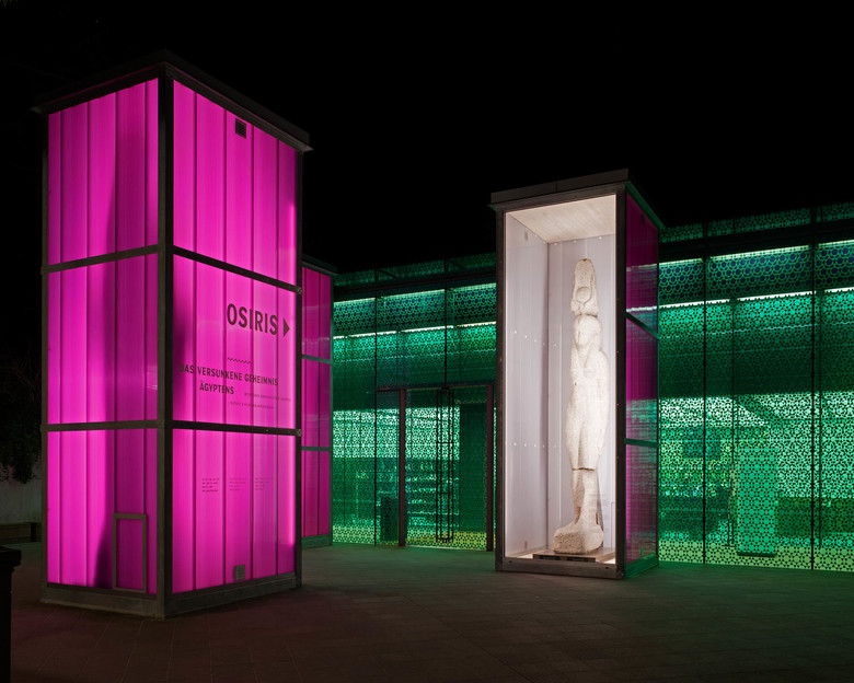 Die Ausstellung bringt den beeindruckenden Schatz zutage, den der Unterwasserarchäologe Franck Goddio im Meer vor der Küste Ägyptens entdeckt hatte. Dazu zählen drei Kolossalstatuen im Hof des Museums. Als Schutz dienen drei Hüllen, deren Konstruktion eine Herausforderung darstellte: Für den Transport sollten sie leicht und formstabil sein, für ein optimales Klima beheizt. Die Statuen durften nicht lange ungeschützt sein. So blieb nur wenig Zeit, um das vorgefertigte, dreiseitig mit Polycarbonat und nach vorne mit einem Sicherheitsglas ausgeführte Stahlgerüst darüber zu stülpen. Das Pink bildet dabei einen Kontrapunkt zur Smaragd-Glasfassade des Museums.