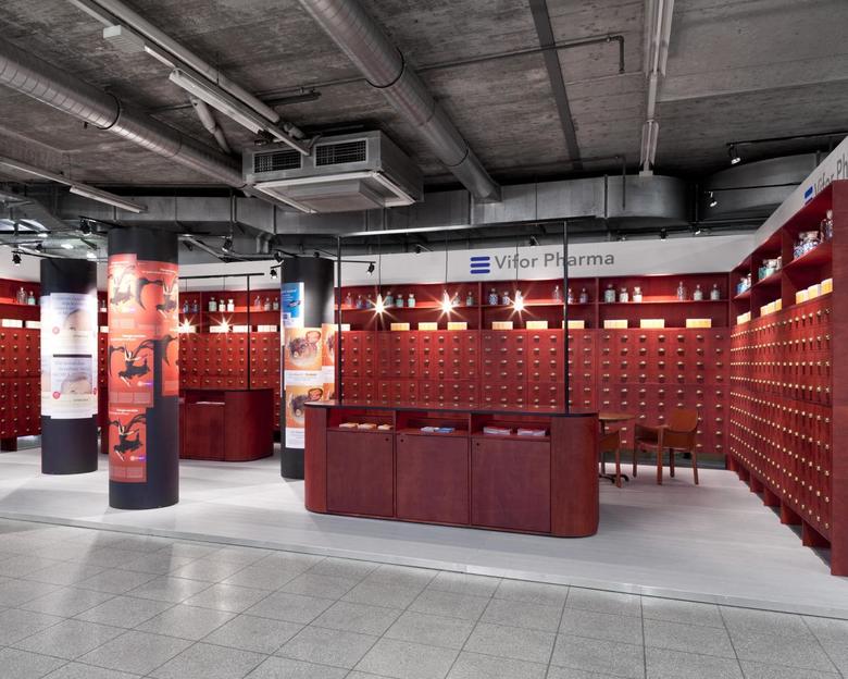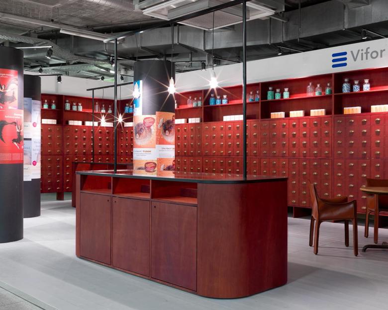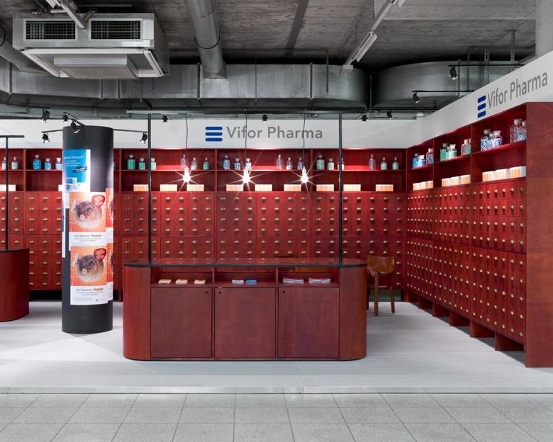 Vifor Pharma ist ein weltweit tätiges Unternehmen im Bereich Erforschung, Herstellung und Vermarktung von Produkten zur Behandlung von Eisenmangel. Die Firma tritt an verschiedenen Ärztekongressen auf, daher musste das Standkonzept flexibel sein, um sich an die jeweilige Situation anpassen zu können. Für die Ausstellung wurde die Idee der alten Apotheke aufgenommen und weiterentwickelt. Das Bild ist geprägt von vielen, kleinen Schubladen und in offenen Fächern darüber präsentieren sich Medikamentenschachteln. Litfass-Säulen orientieren über das jeweilige Thema des Kongresses und an den Verkaufstheken kann man eine individuelle Beratung erhalten.