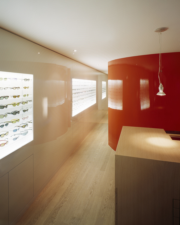 Das Ladenlokal von Optik Viegener ist ein schmaler, langer Raum in einem 70er-Jahre-Haus, im Zentrum St. Gallens gelegen. Ein externes Treppenhaus ragt als abgerundeter Baukörper mitten in den Verkaufsraum hinein und trennt den Eingangsbereich vom dahinter liegenden Beratungsraum ab. Mit Leuchtschaukästen für die Brillen ausgestattet, ist die über die ganze Längsseite verlaufende Ausstellungswand ganz in Hochglanz ausgeführt, sie lenkt die Kundschaft in den hinteren Bereich. Der Boden und die Verkaufstheken sind in Eichenholz gefertigt, im Gegensatz dazu leuchtet das dominante Volumen des Treppenhauses in glänzendem Porsche-orange-1968.