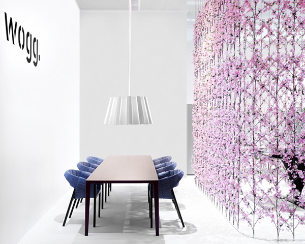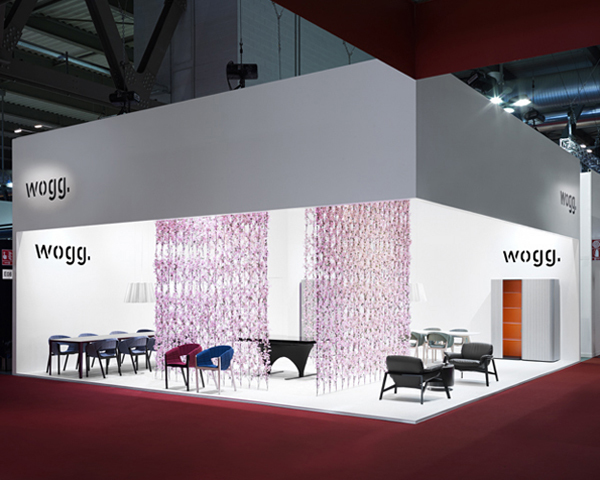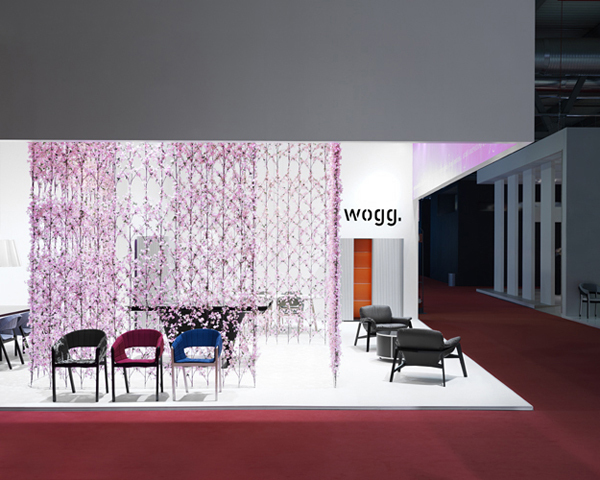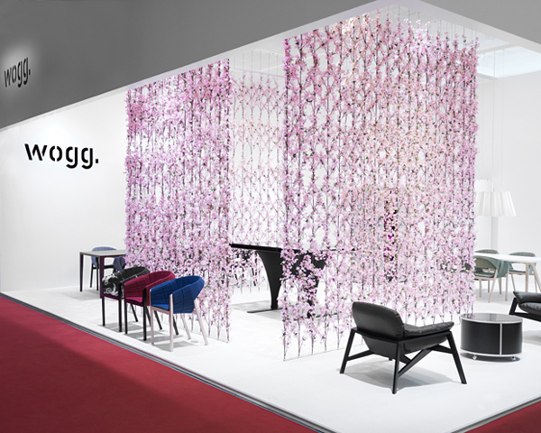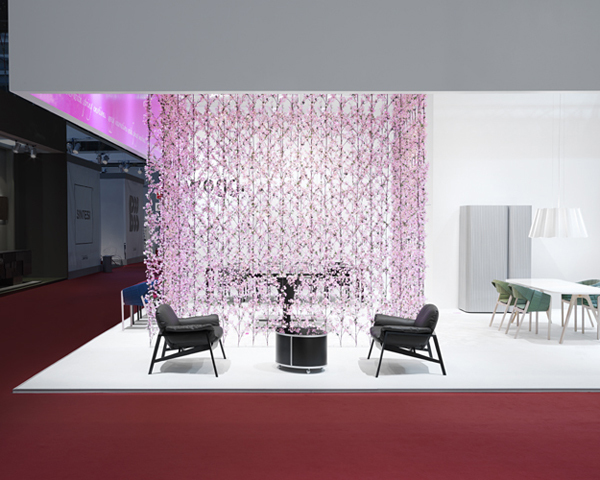 Mit dem Frühling erwacht in Mailand die alljährliche Möbelmesse, an der Aussteller mit kreativen Entwürfen werben und Möbel-Neuheiten die Besucher anlocken. Mit dem Anlocken und Verführen spielt auch die Idee des Kirschblütenvorhangs. Die raumhohe Abtrennung aus künstlichen, rosafarbenen Blüten zoniert die Ausstellungsfläche und lässt Räume entstehen, die der Inszenierung der Möbel dienen. Als transparenter Vorhang gewährt sie zudem spannende Ein- und Durchblicke. Der Stand selbst strahlt in hellem Weiss. Nur wer ihn betritt und in die Höhe blickt, sieht plötzlich pink: Die Innenseite der oberen Blende nimmt die Blütenfarbe auf und intensiviert sie.