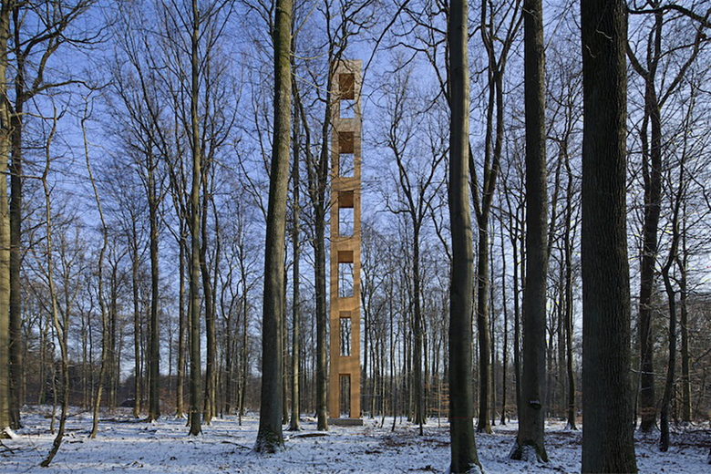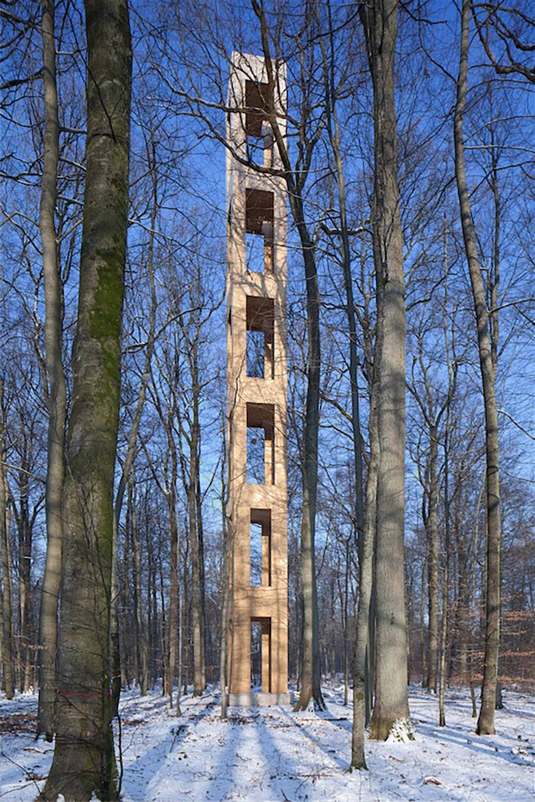 Mitten im Stieleichen-Buchenwald im Hornungstal zwischen Trippstadt und Kaiserslautern steht seit kurzem der hölzerne Turm aus Furnierschichtholz. Das Bauwerk dient den Biologen der Abteilung Pflanzenökologie und Systematik zur Erforschung der in den Baumkronen lebenden Organismen. Hohe Vorgaben wurden von den Biologen gemacht, um eine umweltverträgliche Langzeitforschung zu ermöglichen ohne das Baumkronenökosystem zu beeinflussen. Der Turm darf auf minimaler Grundfläche Prozesse im Waldboden nicht stören, muss sich 36 m hoch zwischen die Baumkronen schieben, darf keine seitlichen Abspannungen besitzen und soll den Forschern in den verschiedenen Stockwerken des Waldes Bewegungsfreiheit bieten - das alles möglichst aus nachwachsenden Rohstoffen und ohne Holzschutz-Imprägnierung, die die angrenzenden Mikroorganismen beeinträchtigt. Um den Forschern einen möglichst offenen Zugang zum Kronenraum der zu untersuchenden Bäume einzurichten, wurde ein Rahmentragwerk gewählt und auf die bei solchen Bauwerken sonst übliche Diagonalaussteifung verzichtet. somit besteht über die großen Öffnungen maximale Bewegungsfreiheit über die volle höhe des Baumes. Auf den sechs großzügigen Plattformen haben die Biologen Raum für Forschung und Lehre. Über zusätzliche Ausleger besteht die Möglichkeit, auch die entfernteren Kronenbereiche in Augenschein zu nehmen.