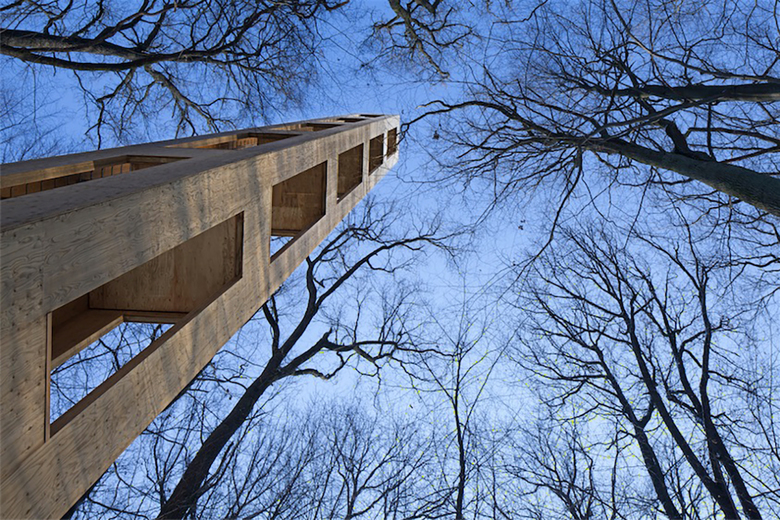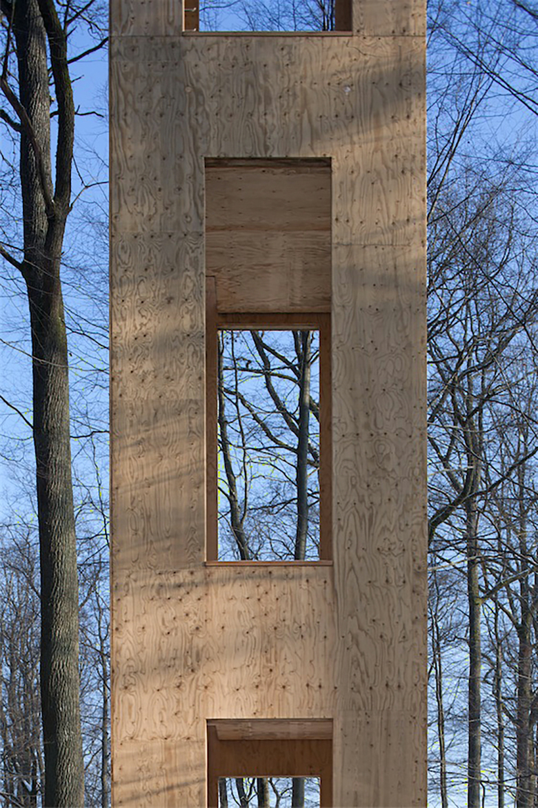 Das aus unbehandelten kerto®-Furnierschichtholzplatten erstellte Bauwerk mit einer Grundfläche von nur 3 x 3 Metern steht auf einer 110 Zentimeter starken Stahlbetonfundamentplatte, die auf Kleinbohrpfählen gegründet ist. Die vier zug- und druckbelasteten Bohrpfähle sind ca. 10 Meter ins Erdreich eingebunden, davon ca. 4 Meter in Fels. Um den Turm ausreichend vor bodenfeuchte und schlagregen zu schützen wurde die Fundamentoberkante etwa 60 Zentimeter über den Waldboden gelegt. Von dort geht es per Steigleiter über sechs zwischenebenen hinauf bis zu den Wipfeln der rund 35 Meter hohen Bäume.
