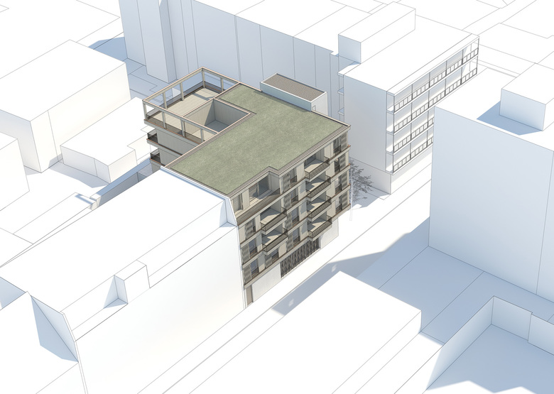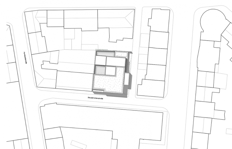 Als Blockrandbebauung schließt der Neubau städtebaulich konsequent an den Bestand an akzentuiert das Ensemble mit einem zeitgemäßen architektonischen Ansatz. Vier Geschosse zuzüglich Staffelgeschoss fügen sich höhenmäßig in den vorhandenen Straßenzug. Das Einrücken von der seitlich verlaufenden Gasse erlaubt die Wahrung des Brandabstandes zum Nachbargebäude Ecke Richard-Wagner-Straße und damit die Öffnung für Belichtung und Belüftung des Neubaus hin zur Ostseite. Der Treppenturm mit Brandwand an dieser Fassadenseite ermöglicht die optimale Platzausnutzung des Grundstücks; der Aufzug sichert die barrierefrei Erschließung des Gebäudes.