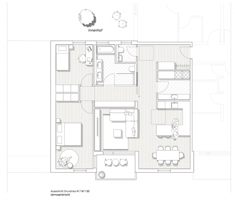 Wohnungsgrößen zwischen 45 bis 120 Quadratmeter, als Ein-, Zwei- und Dreizimmerwohnungen mit großzügig fließenden Grundrissen, durchgehend mit Loggien und zum Teil Dachterrassen zum Außenraum hin geöffnet. Stauraum und Hauswirtschaftsräume innerhalb aller Wohneinheiten, sowie separate Keller- bzw. Kellerersatzräume außerhalb der Wohnungen.