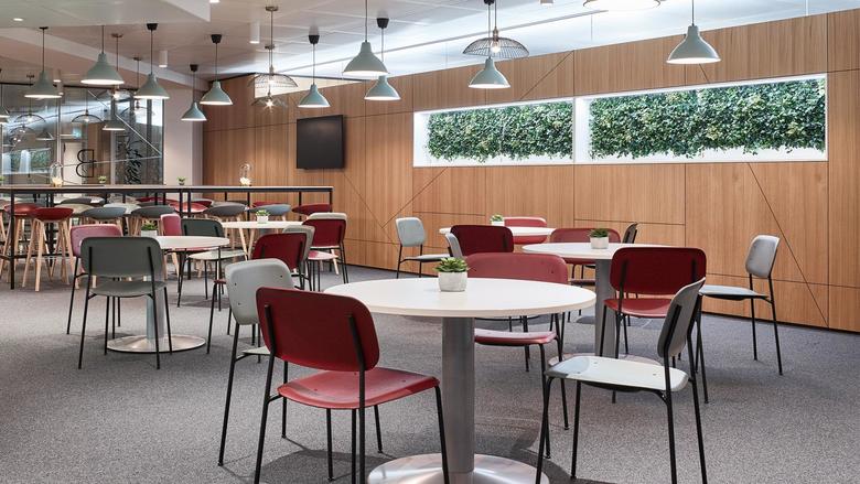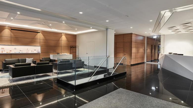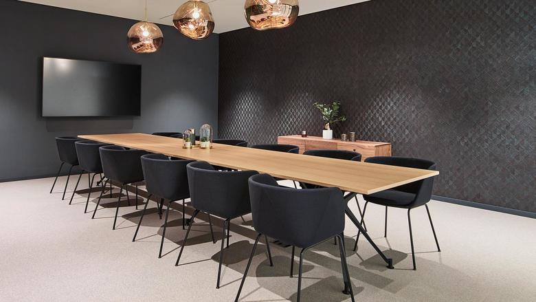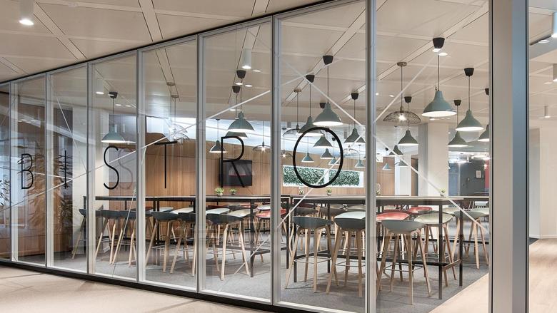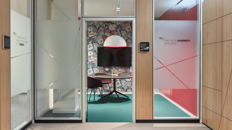 Der Bedarf an natürlichem Licht teilt das Gebäude in zwei Bereiche. Entlang der Fensterfront befinden sich auf fünf Stockwerken neue Arbeitsplätze für rund 400 Mitarbeitende, während die soziale Interaktionszone Besprechungsräume, Netzwerk- und Ruhezonen und eine Cafeteria umfasst. Die zwei Bereiche sind durch eine Membranwand abgetrennt, die sich durch alle Stockwerke zieht. Die Holzwand wirkt sowohl lichtdurchlässig als auch schallabweisend. Zusätzlich dient sie als Garderobe, Teeküche oder Telefonkabinen.