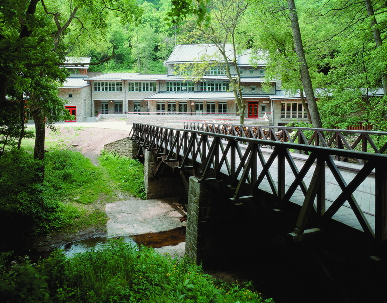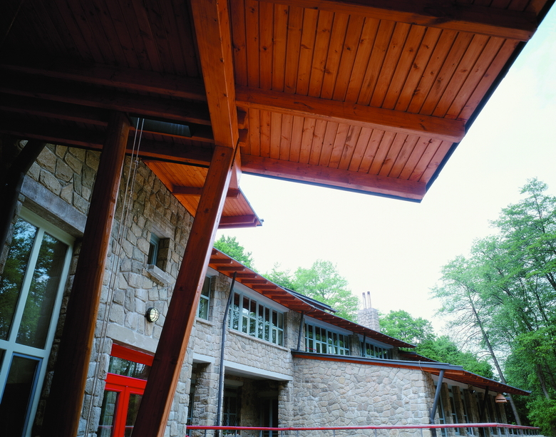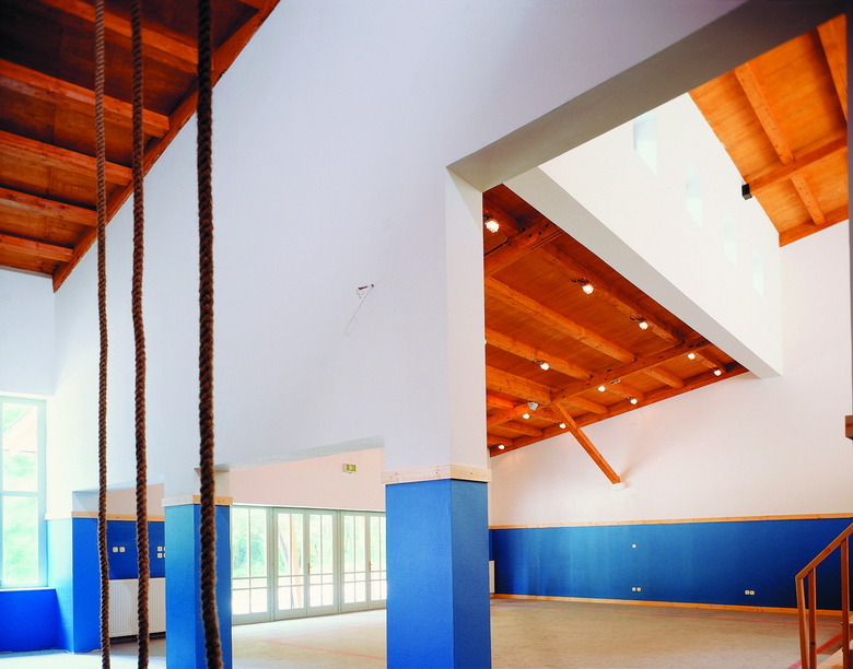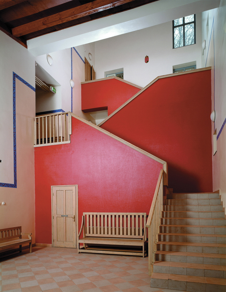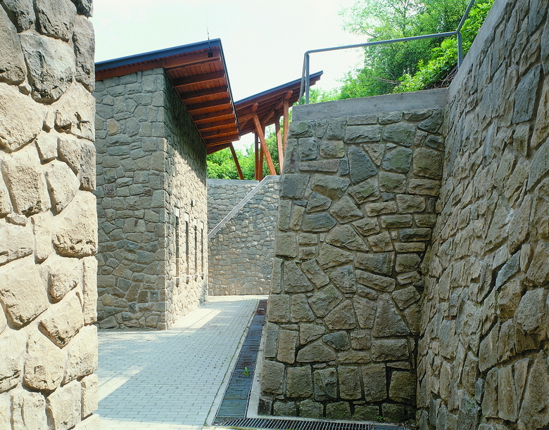“The space-system of the building fits to the steep mountain slope step by step in such a way that one can get out from almost all levels of the house to the surrounding site. The whole building with its corridors, rising parapets and abstract, painting-like world of color opens up in the space of the main staircase. The mass of the building moves according to functional needs, while the permanent pitch-angle of the roof, the stonework and the homogeneity of the titanzink-roof represents unity. The architectural language of the forest school, its details independent form any kind of fashion reach timeless expressions. This work is one of the most well-done piece of contemporary Hungarian architecture.”