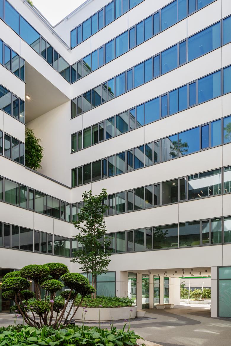 To sustain well-being, a building must meet several conditions. One of these is the integration of nature into architecture. The intense presence of biophilia within the building creates harmony between the built environment and nature and interrupts the precisely structured system of the building. The floor plan is effortlessly transparent because of its rational structure: three pairs of atria divide the framed complex into four blocks. Due to this structure, there is a continuous visual link between the green corridors connecting the wings, the roof gardens, and the green spaces on the ground floor with the workers. In addition, the placement of trees in three-story-high projections breaks up the unified mass of the building with an explicitly distinctive solution. These trees give the external façade an exciting appearance, while in the interior they create comfortable terraces for informal encounters. The dynamism of the building is further strengthened by the roof terraces of the longitudinal wings, which open from the fifth floor, lower than the eight-story mass. In addition to the intense presence of flora, the organic design and the use of natural materials in the interior further emphasize the significance of biophilia.