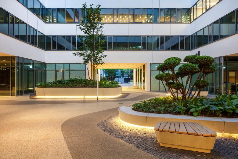 The provision of sufficient natural light plays an essential role in enhancing the well-being of workers. Thanks to the geometry of the tracts, workers at all workstations can enjoy natural lighting. In addition to the biophilia and natural lighting, the acoustic solutions, the provision of adequate air quality, and the design of intelligent systems to control lighting, cooling and heating will enhance the positive impact of the building. In addition, collaborative and relaxing comfort zones were designed alongside the comfortable office space to entice workers back from the home office. In the spirit of sustainability, rainwater is used to irrigate the greenery and is also used in the restrooms. The 878-space car park has 20 electric chargers. Among others, these solutions are part of the complex’s client’s efforts to achieve LEED Gold certification.