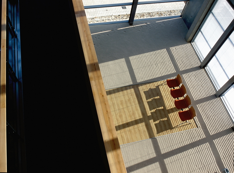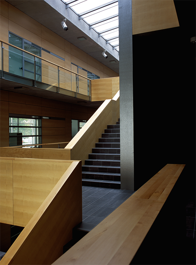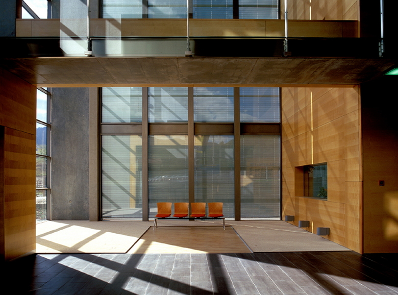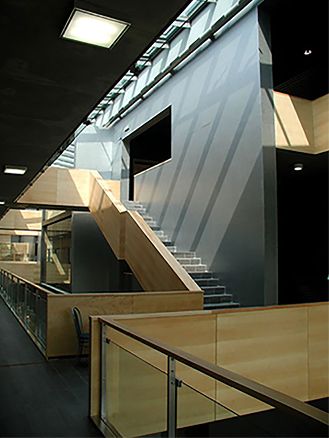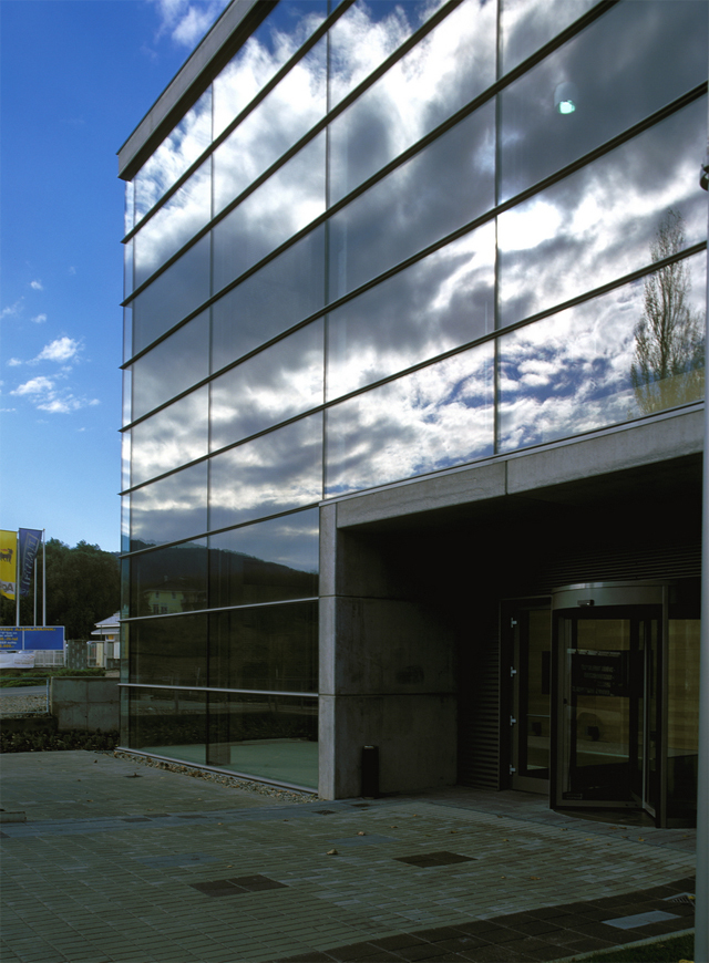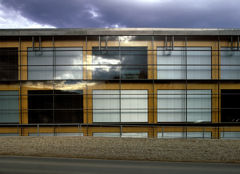 The space structure of the Innovational Building can be divided into three narrow zones. The first zone is made up of the offices placed on three stores. The elegant passageway is connected to this part with bridges and skylights. Then follows the zone of the service rooms- the meeting rooms, the kitchenettes and bathrooms can be found here. The 550 m2 test plant is connected to the service zone. The double-layered climate-façade constructed on the street-side façade heats the building during wintertime while cools down inner parts during the summer. The building won the Architectural Prize of the journal Figyelő in 2003 and the Pro Architectura Prize in 2004.