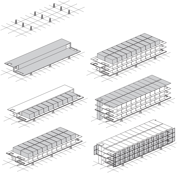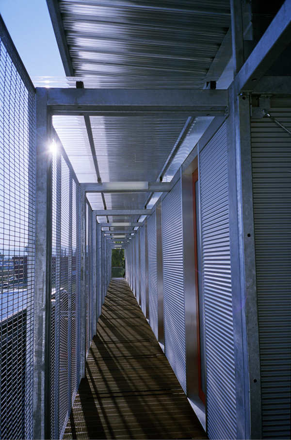 Die Architektur reagiert bedingungslos auf diese Idee der stark optimierten Versorgungsstruktur. Durch eine kostengünstige, pragmatische, schnörkellose Bauweise mit vorgefertigten Elementen und Bauteilen war es möglich eine minimale Bauzeit, bzw. Aufstellzeit von drei Monaten zu realisieren.
