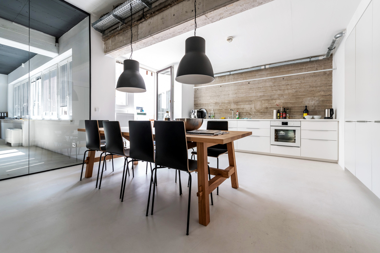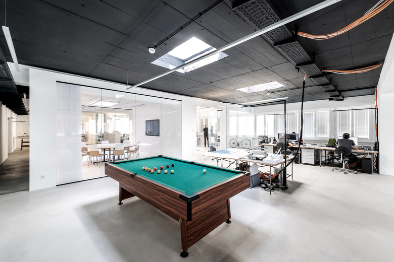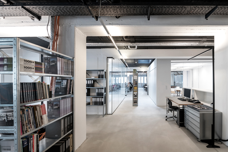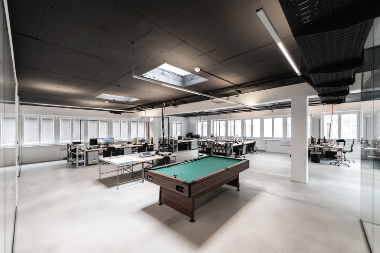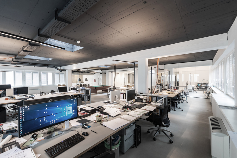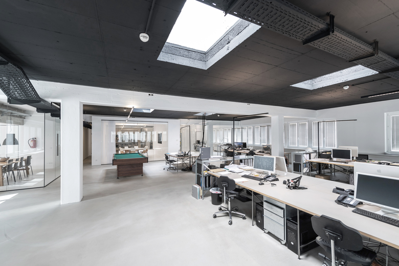 Die offene Gesamtstruktur des Büros ermöglicht Blickachsen zwischen Arbeitsplätzen, Besprechungszimmern und Teambereichen. Optisch wurde ein zeitlos moderner Industriestyle in klassischer Farbgestaltung gewählt, der die funktionelle Gestaltung hervorhebt. Im Hauptraum ist die Decke in schwarz, in den abgetrennten Räumen in weiß gehalten. Rohre und Kabelkanäle sind sichtbar, der Boden ist versiegelter Estrich – in den abgeteilten Bereichen weiß beschichtet.