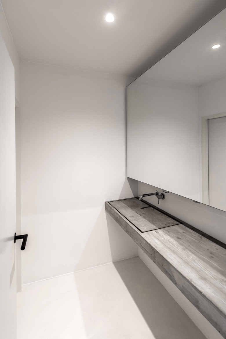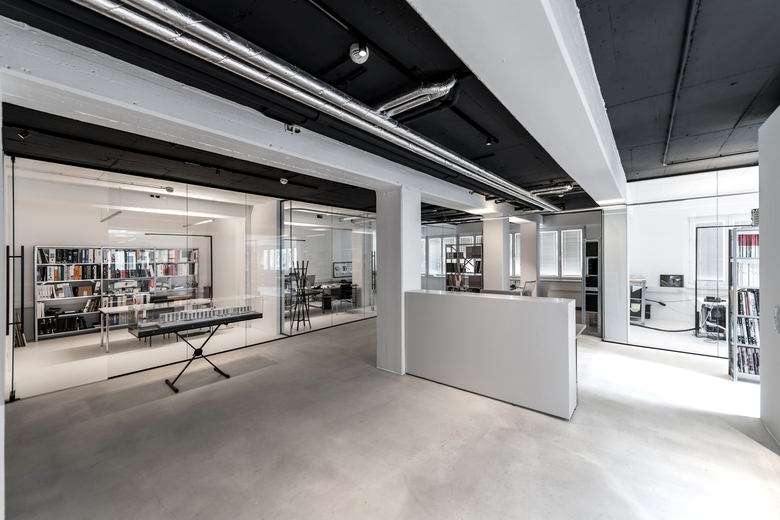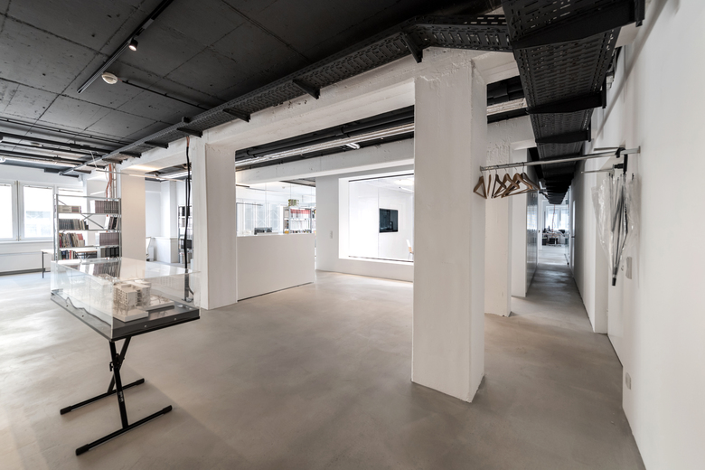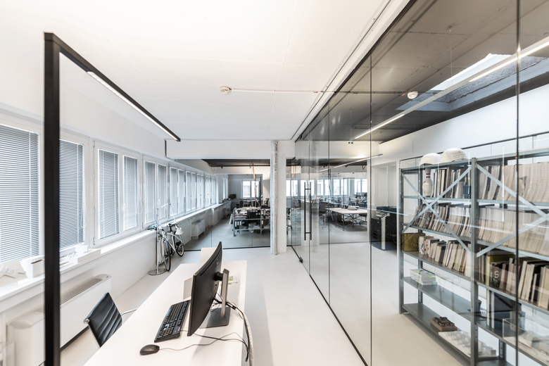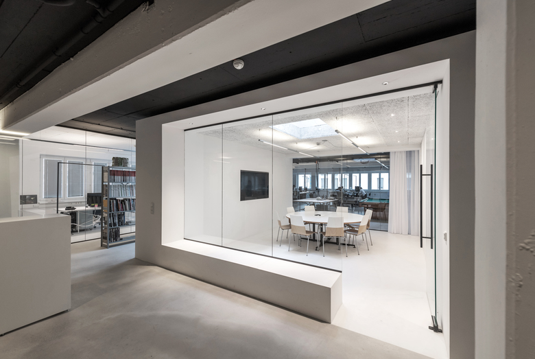Raumprägend ist der zentral angeordnete Besprechungskubus. Er zoniert die Gesamtfläche in zwei offene Bereiche: einen vorderen Empfangs- und Managementbereich und einen hinteren Projekt-Arbeitsbereich. Drei Räume – zwei Büros und ein Besprechungszimmer – sind durch Glaswände abgetrennt. Der großzügige Projekt-Arbeitsbereich bietet viel Raum für flexible Arbeitsplatzgestaltung. Eine Glaswand ermöglicht den freien Blick auf die Küche mit Übergang zur Terrasse.