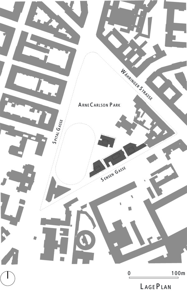 Das Projekt reagiert auf die Situation mit einer linearen Baukörperstruktur entlang der Sensengasse und einer im erweiterten Park positionierten freistehenden „Stadtvilla“. Die lineare Bebauung, bestehend aus drei miteinander verknüpften Einzelbaukörpern stellt eine membranartige Zäsur zwischen Parkraum und Stadtraum dar.