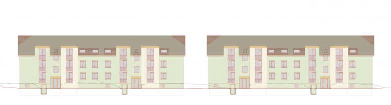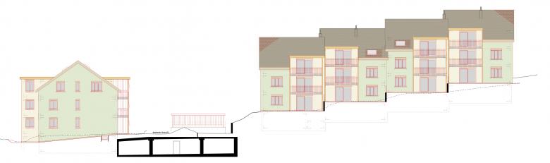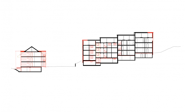 Das abgetreppte Haus erfährt keine Grundrissänderungen; hier werden lediglich Küche und Nasszellen sowie die Haustechnik erneuert, weil die Sanierung in bewohntem Zustand erfolgt.
