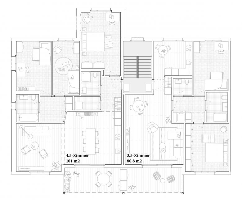 Die zwei baugleichen Häuser werden in der Grundrissfigur verändert, damit effiziente 4.5-und 3.5-Zimmerwohnungen entstehen. Dank der neuen Typologien vergrössert sich das Raumgefühl in den Wohnungen. Die Balkone sind mit neuen Geländern und Pflanzenberankung freundlicher gestaltet. Die Sanierung erfolgt in entmietetem Zustand.