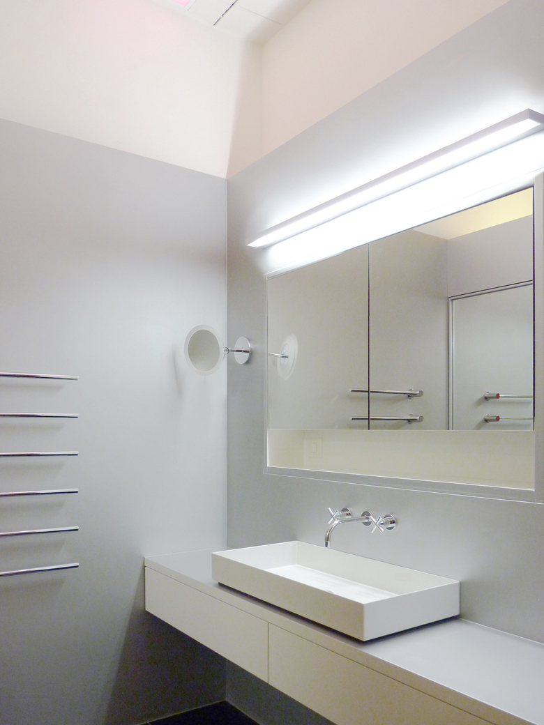 Das WC und die Dusche werden durch einen Deckel mit Plexiglasausschnitt, der den Blick auf die Industriedecke frei gibt, geschlossen. Über dem raumbreiten Waschtisch ist der Kubus nach oben offen. Ein Oberlicht zum darüberliegenden Erdgeschoss bringt Tageslicht in den sonst ausschliesslich künstlich belichteten Raum. Im Oberlicht ist ein farbiges LED-Band eingelegt, damit es bei Nacht als Leuchtkörpter funktionieren kann.