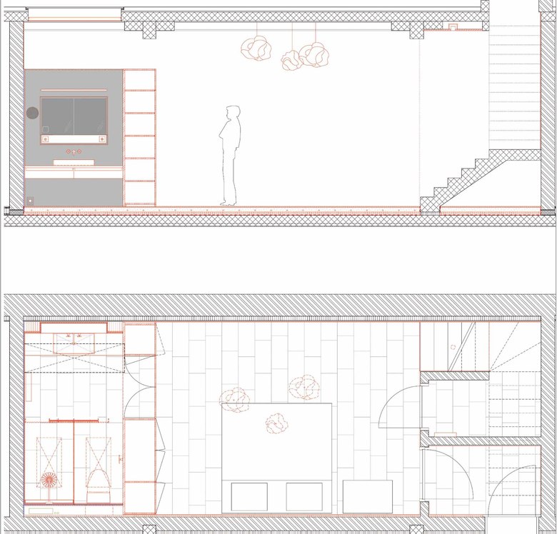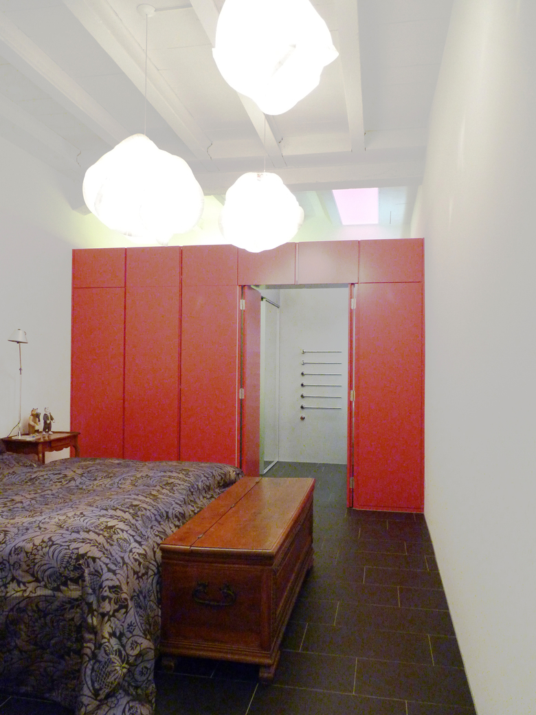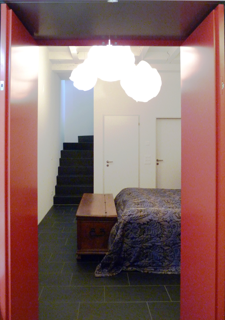 In einer zweigeschossigen Loft, galt es im Untergeschoss den Kellerraum zum Schlafraum mit eingebautem Badezimmer auszubauen. Die Raumhöhe von 3.5 m und die bestehende Hourdis-Decke auf Stahlträgern boten ideale Voraussetzungen, um den Loft-Charakter zu betonen.