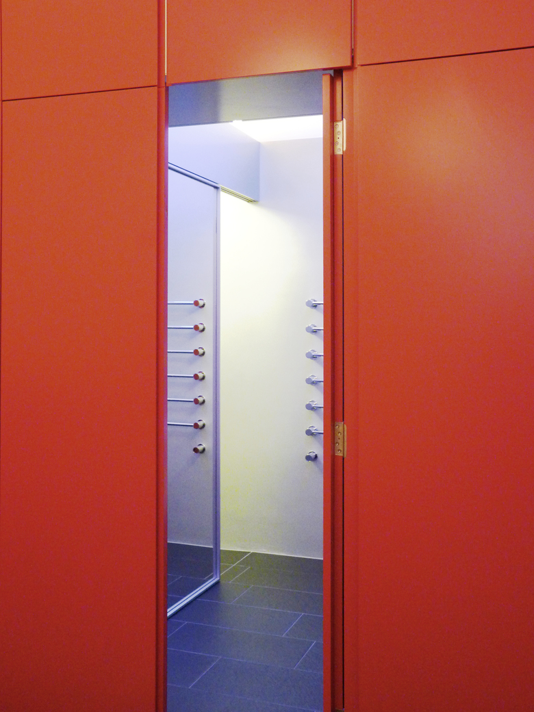 Jede Nische des Kubus ist optimal ausgenützt: zum Zimmer bieten vier Wandschränke Stauraum; die Flügeltüren zum Badezimmer öffnen sich in die Leibung, so dass sie nicht im Weg stehen, eine Schiebetür mit grossflächigem Spiegel verschliesst entweder das WC oder die Dusche, der Spiegelschrank wurde in der Vorwand versenkt und in der Auflagefläche des Waschtischs sind zwei Schubladen integriert.