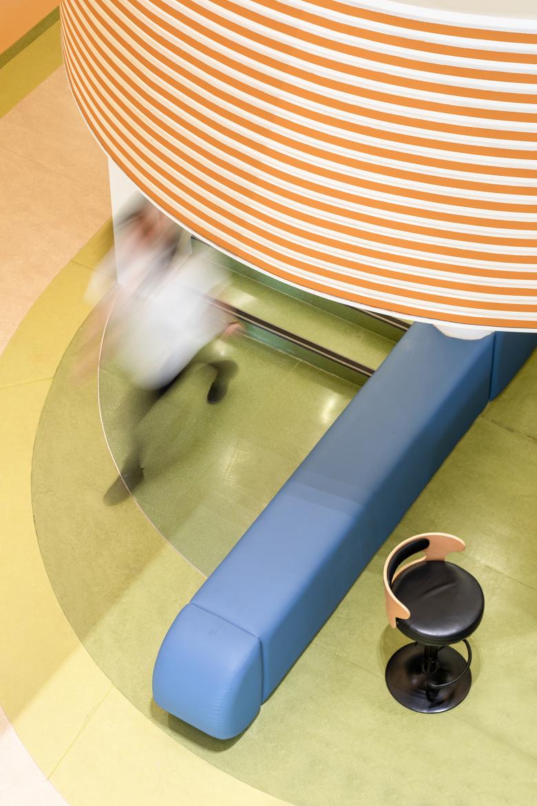 Recreation space is mixed between traditional elements of play and more informal further-learning space. Reading areas and art equipment are interspersed between a ball pit, trampoline, slide and climbing wall, with their circular forms allowing them to stack and reflect the wider multilayered scheme.
