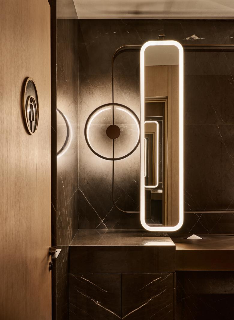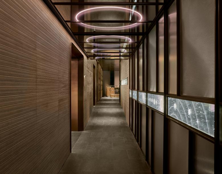 The journey begins at the threshold on the 30th floor, where a polished reception desk with mirrored curves greets visitors beneath a softly glowing backdrop, striking a balance between refinement and anticipation. Beyond it, the corridor acts as a passage into another realm: a mirrored ceiling stretches the perspective while reeded glass walls blur the outlines of the garden outside. Cutting across the surface, a luminous glass “belt” etched with solar system motifs anchors the design with a delicate nod to astronomy. These materials shift in character with time—by day, shimmering with natural reflections that suggest openness and clarity; by night, glowing softly as the circular ceiling light transforms into a floating cosmic feature that ushers guests deeper into the atmosphere of STARS.